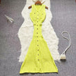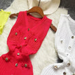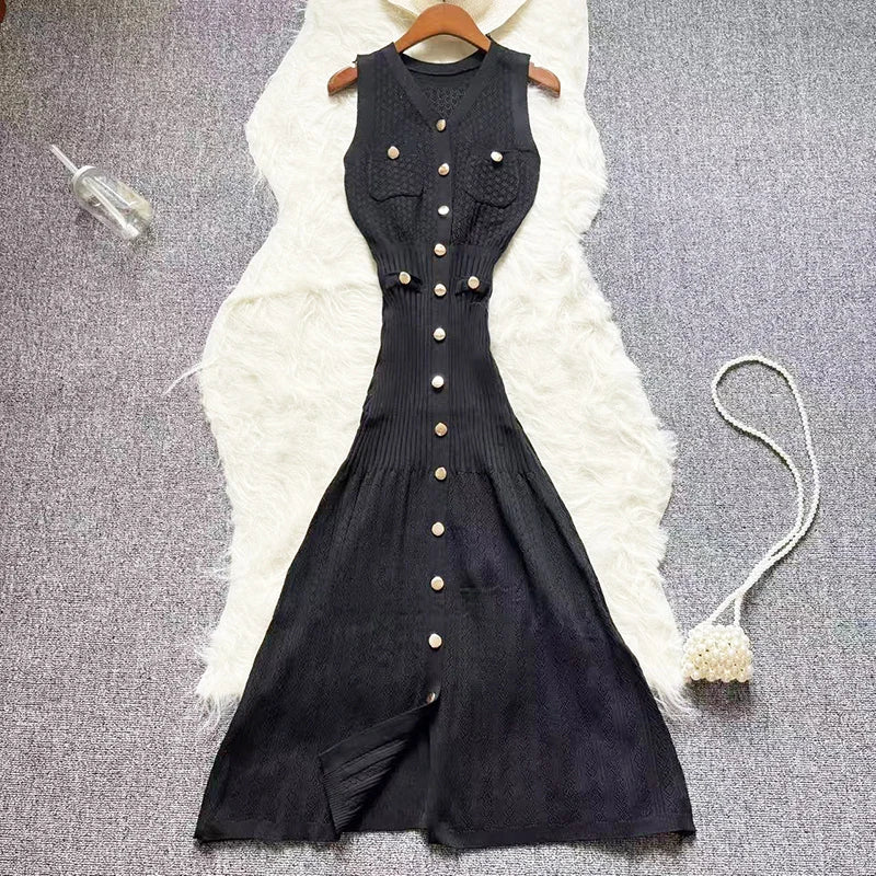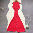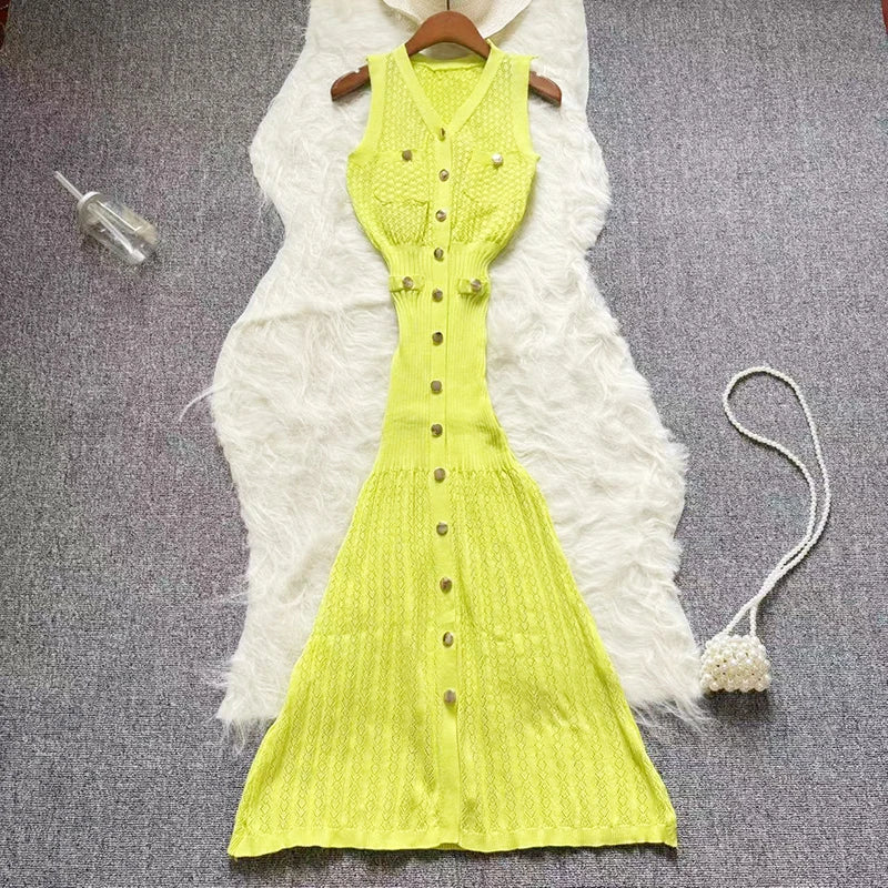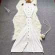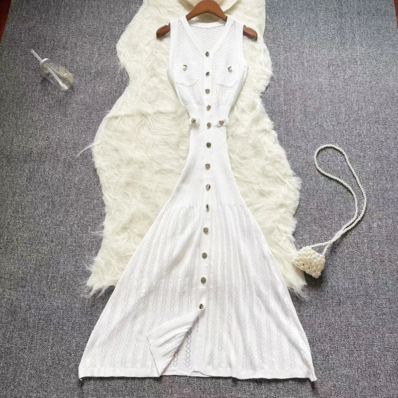 Casual Knitting Long Dress Women Buttons V Neck Hook Flower Hollow Out Chic Maxi Long Dress