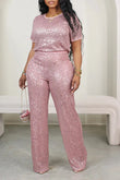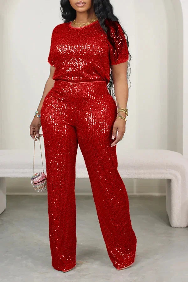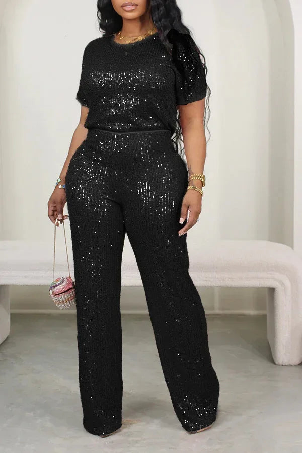 Casual Sequin Two Piece Set for Women Solid Short Sleeved Tshirt Wide Leg Pants Two Piece Set