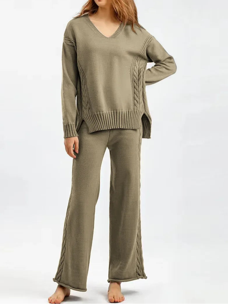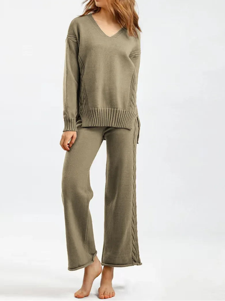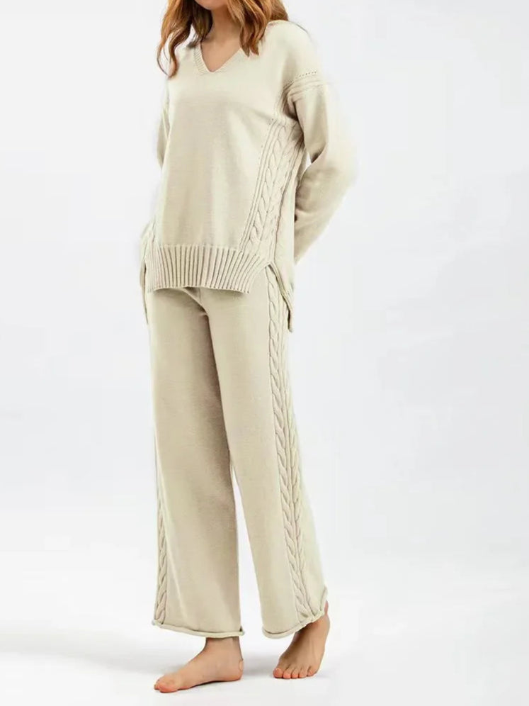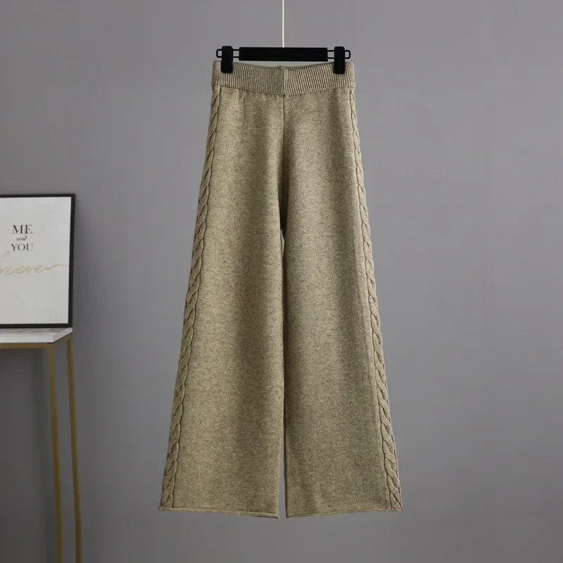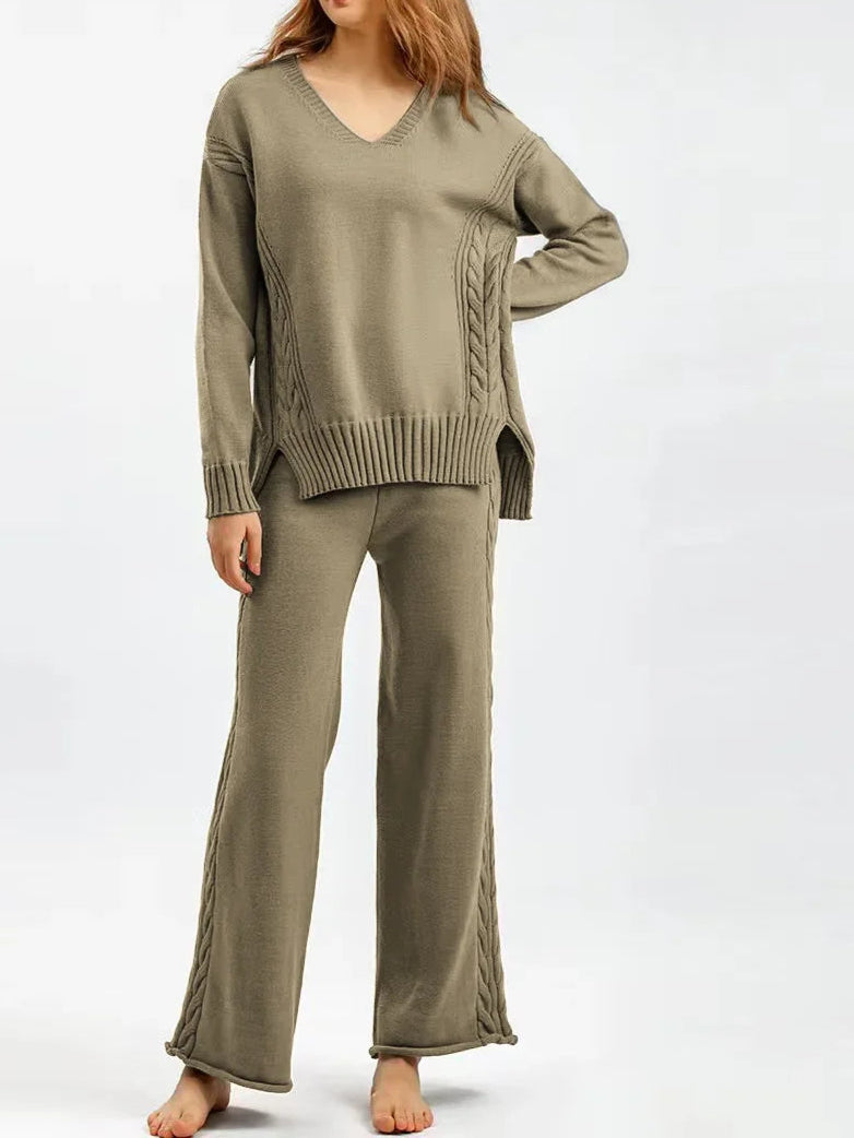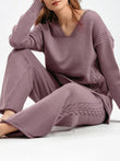 Thick Knit Sweater Set Women Tracksuit Solid Color V Neck Sweaters + Pant Two Piece Set