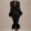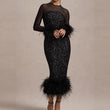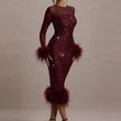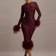 Casual O Neck Mesh Long Sleeve Party Midi Dress Feather Patchwork Slim A-line Sequin Cocktail Dress