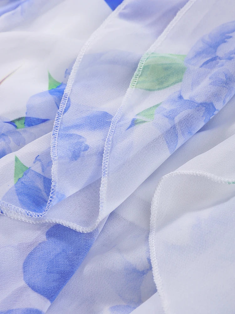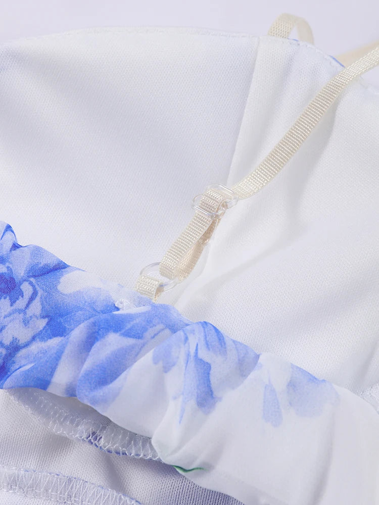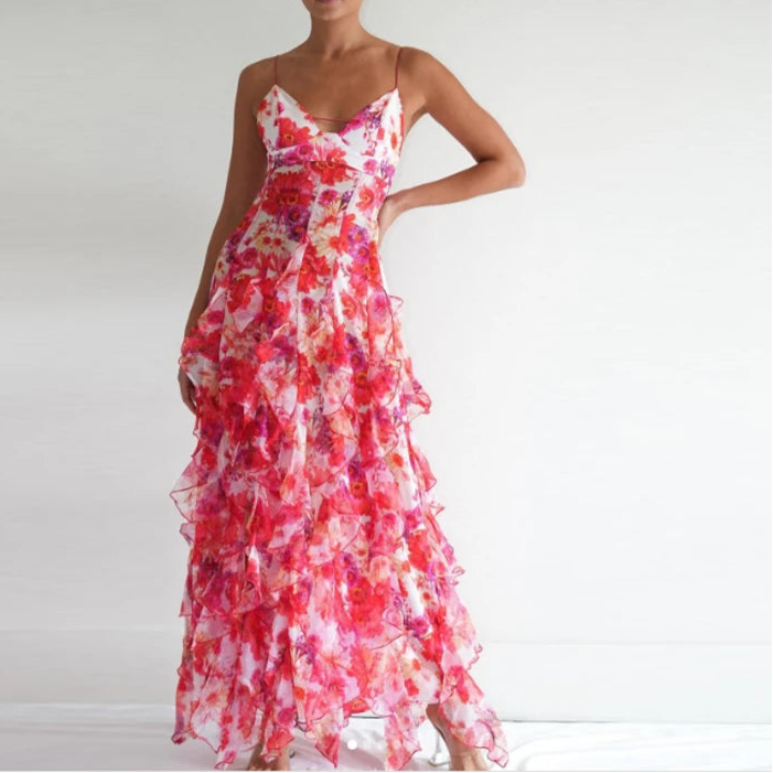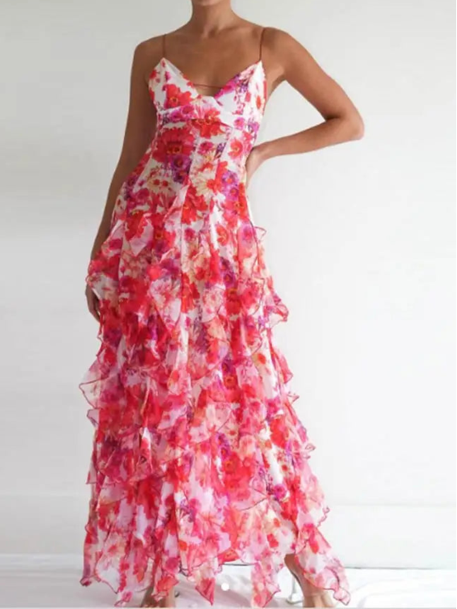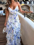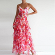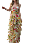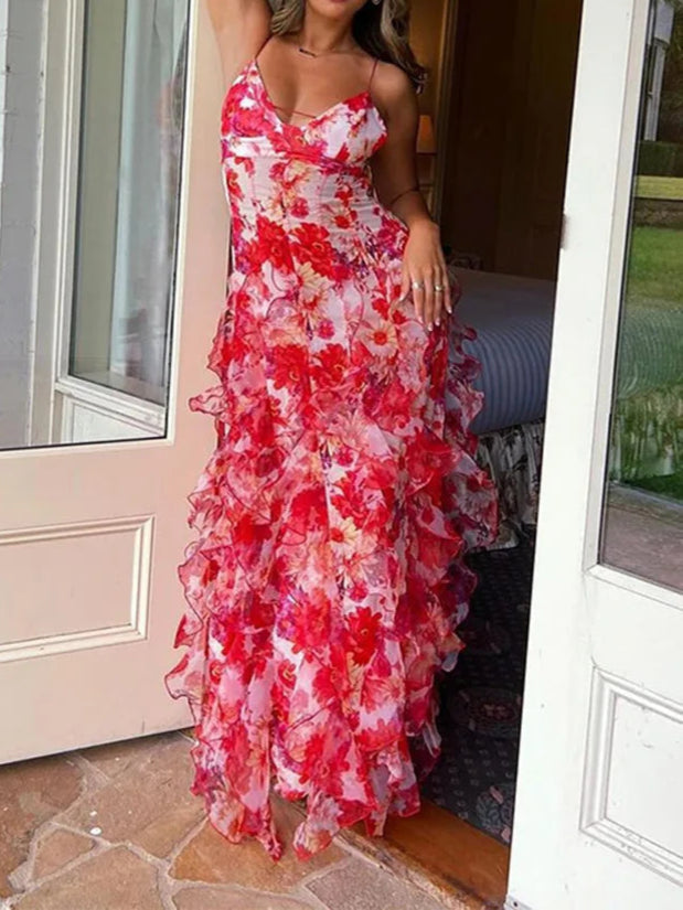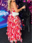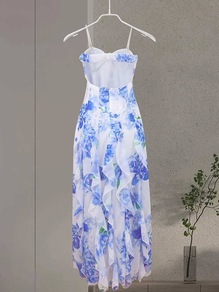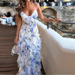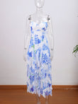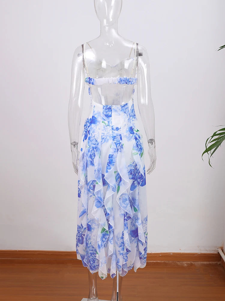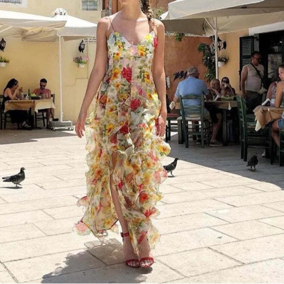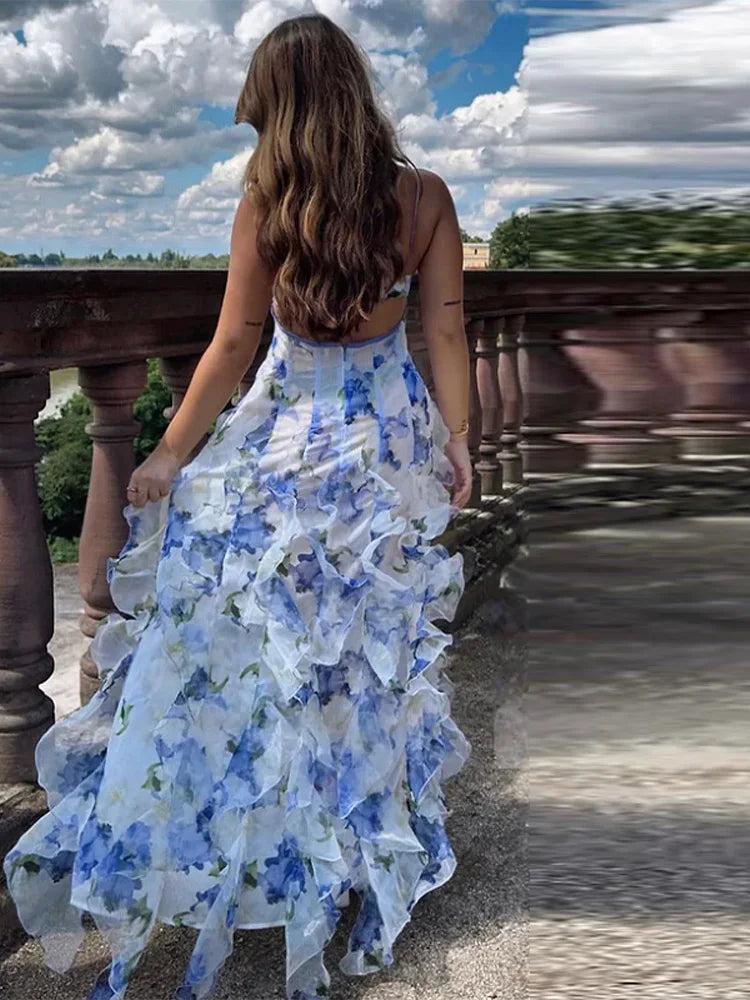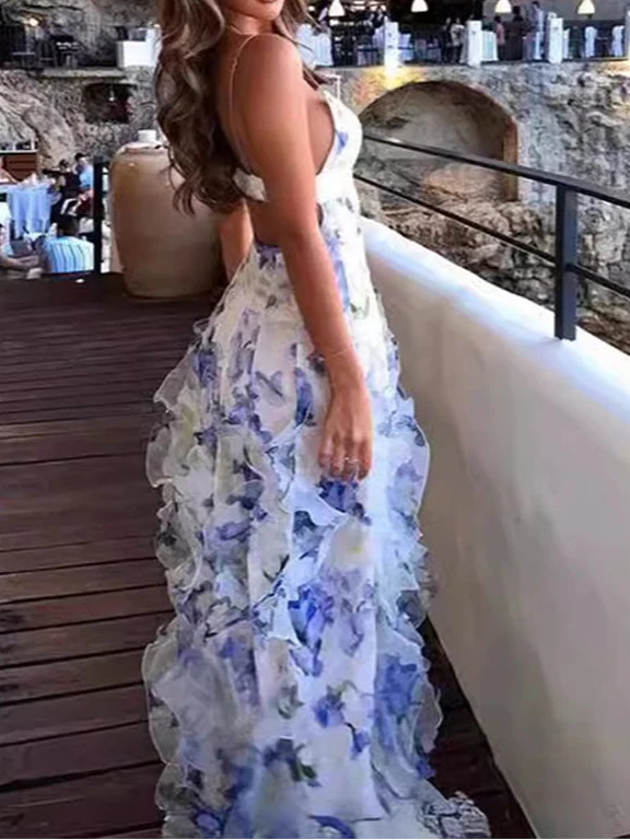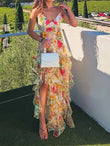 Chiffon Print Ruffles Slip Dress Sleeveless Backless Side Split Party Evening Dress