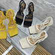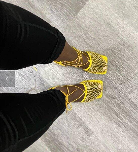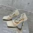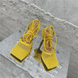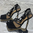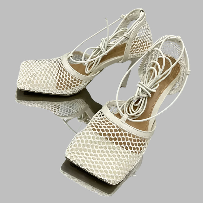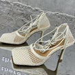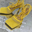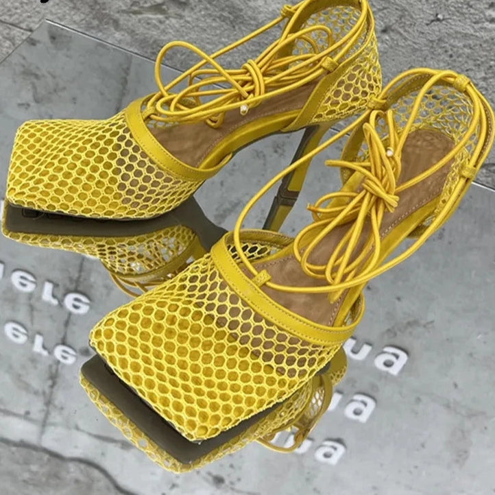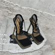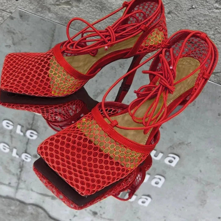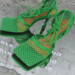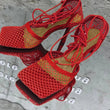 Fish Net Square Toe Heels Sandals Female Square Toe High Heel Lace Up High Heels