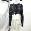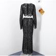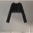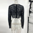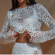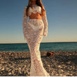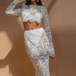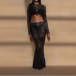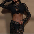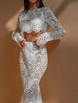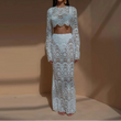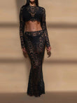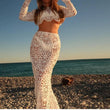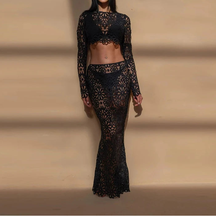 Summer Vacation See Through Crochet Top Women Set Hallow Out Flare Long Sleeve Skirts Set