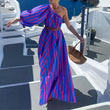 Striped Maxi Dress Women Off Shoulder One Sleeve Skew Neck Party Club High Waist with Sashes A-line Maxi Dress