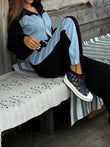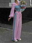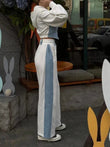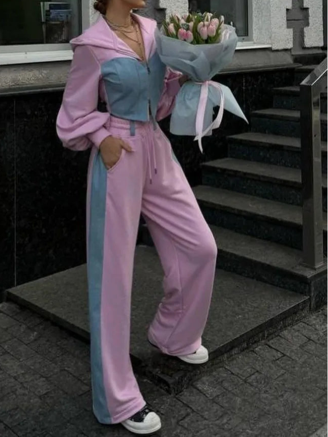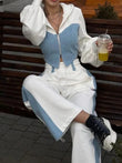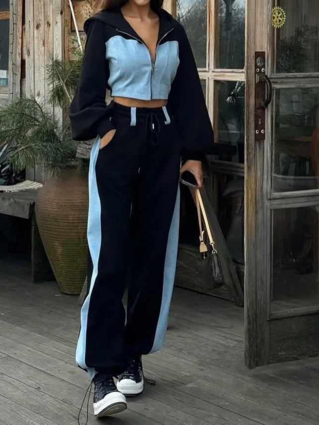 Patchwork Denim 2 Piece Sets Women Outfit Slim Hoodies Crop Top Wide Leg Sweatpants Suits