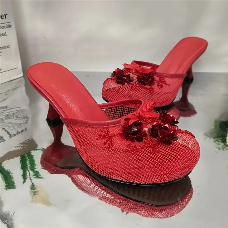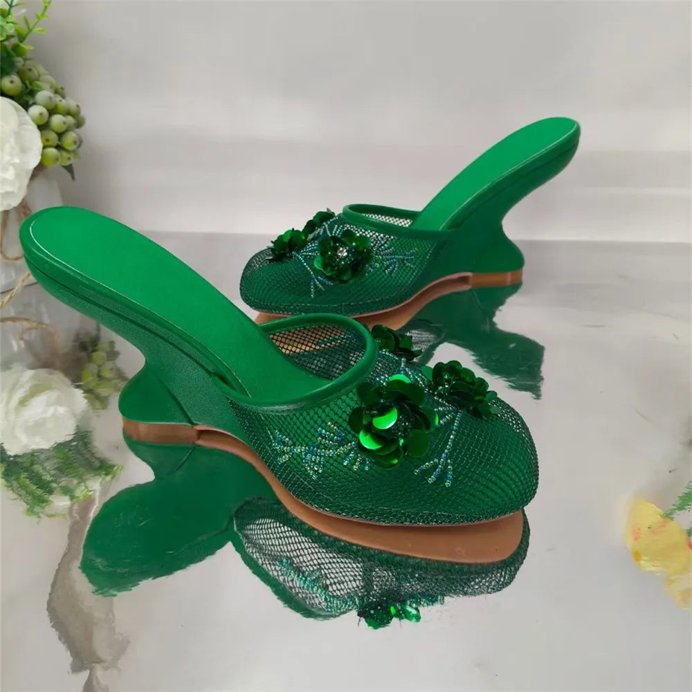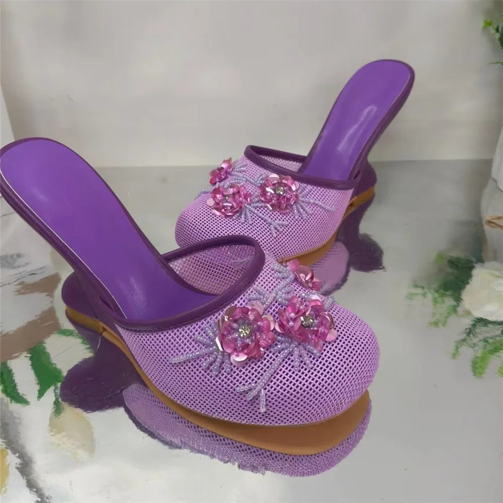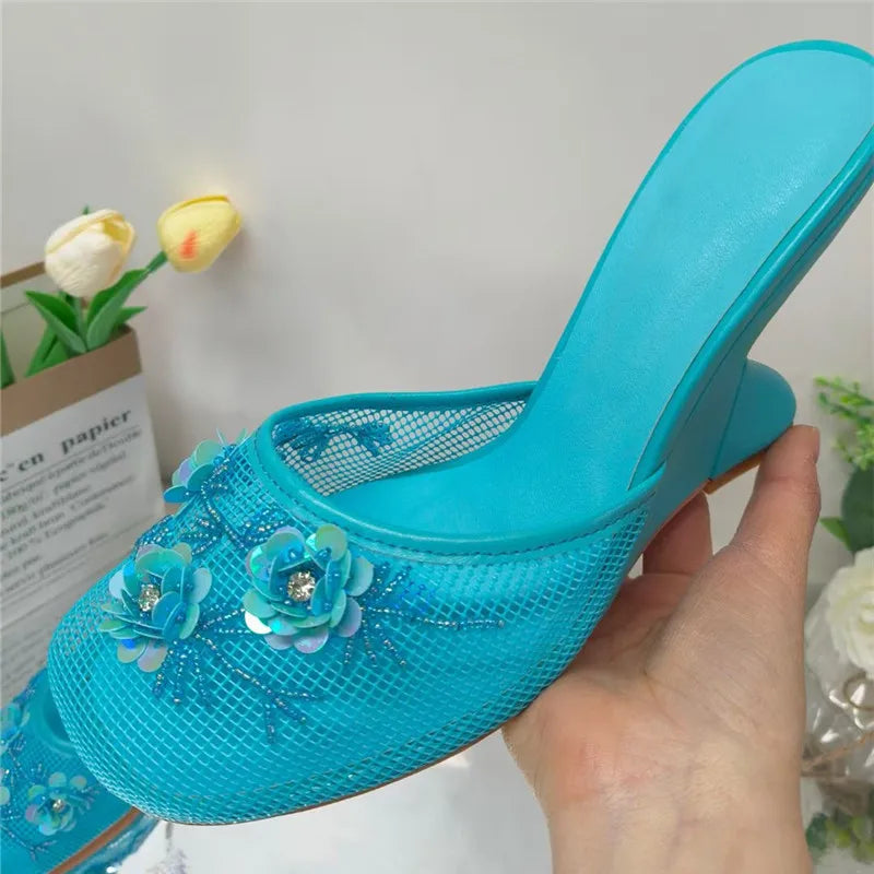 Women Summer Wedges Mesh Shoes Flower Round Toe Slip-On Hollow High Heeled sandals