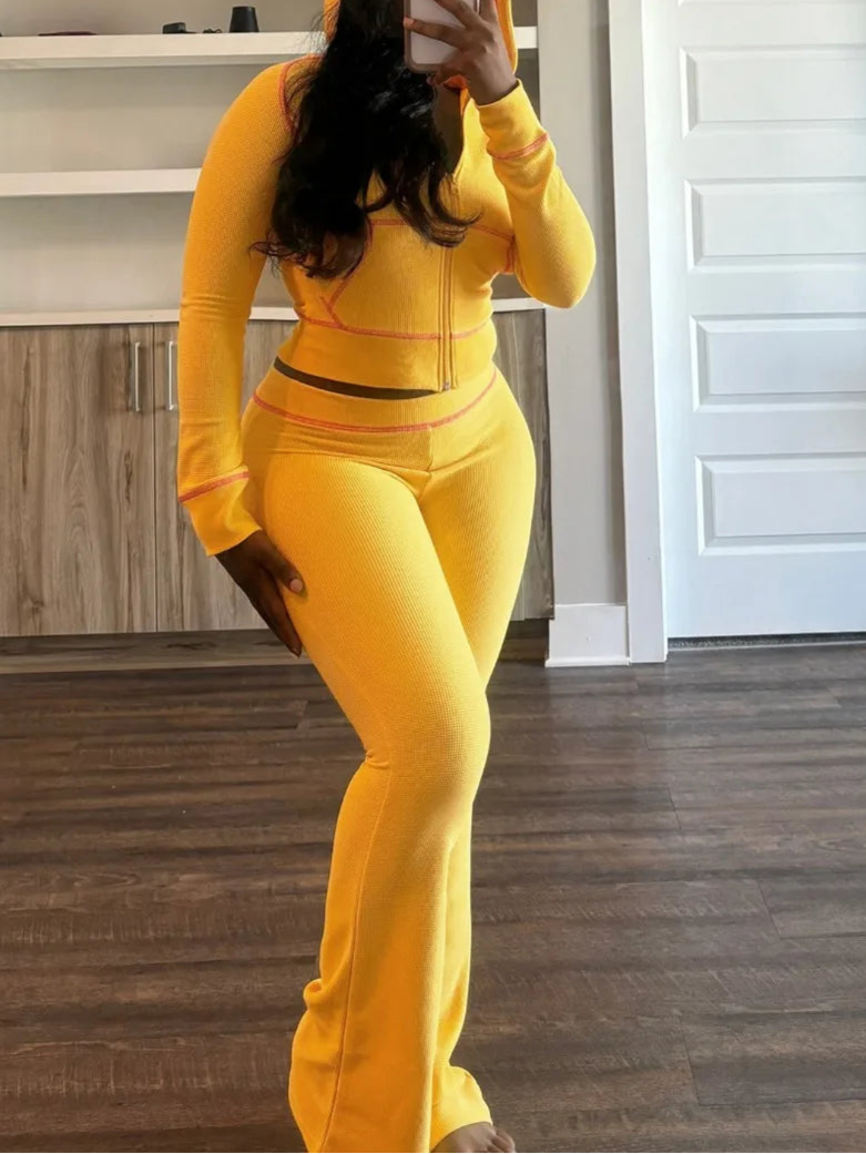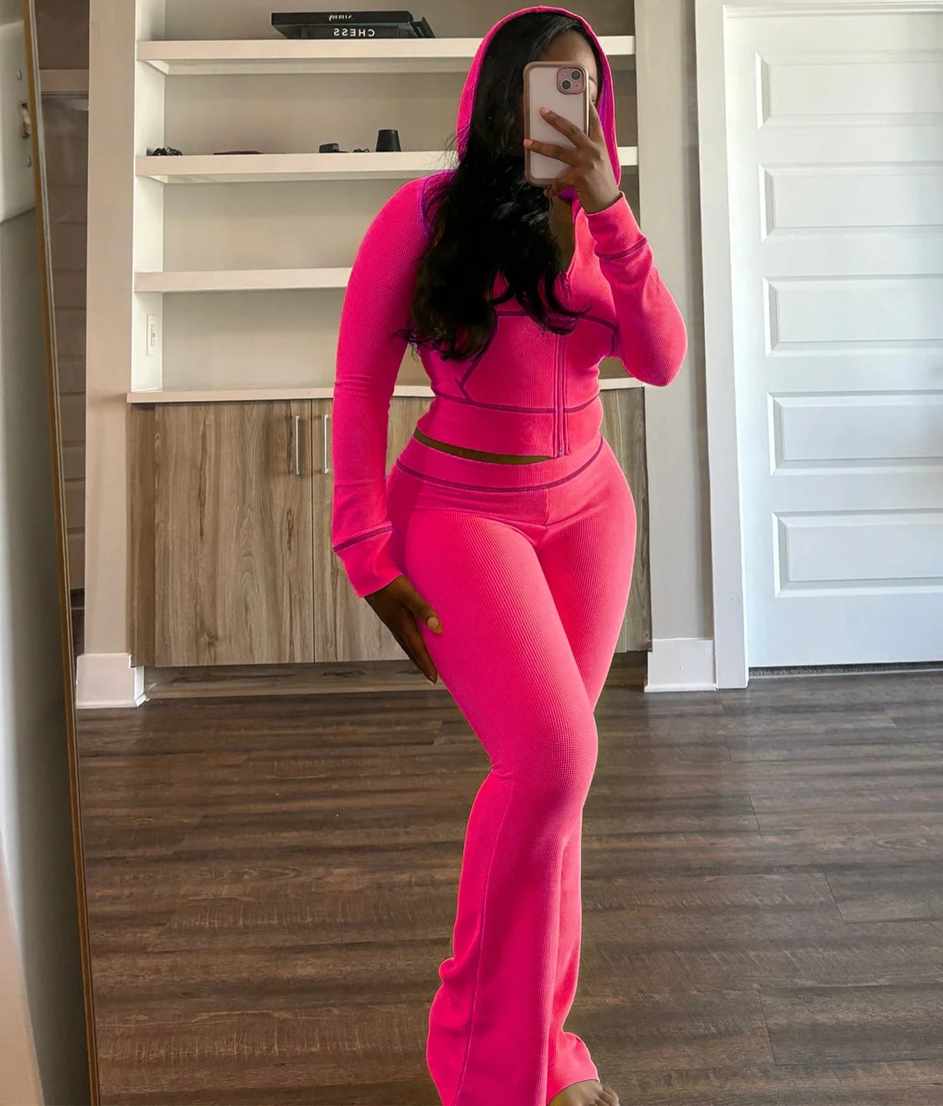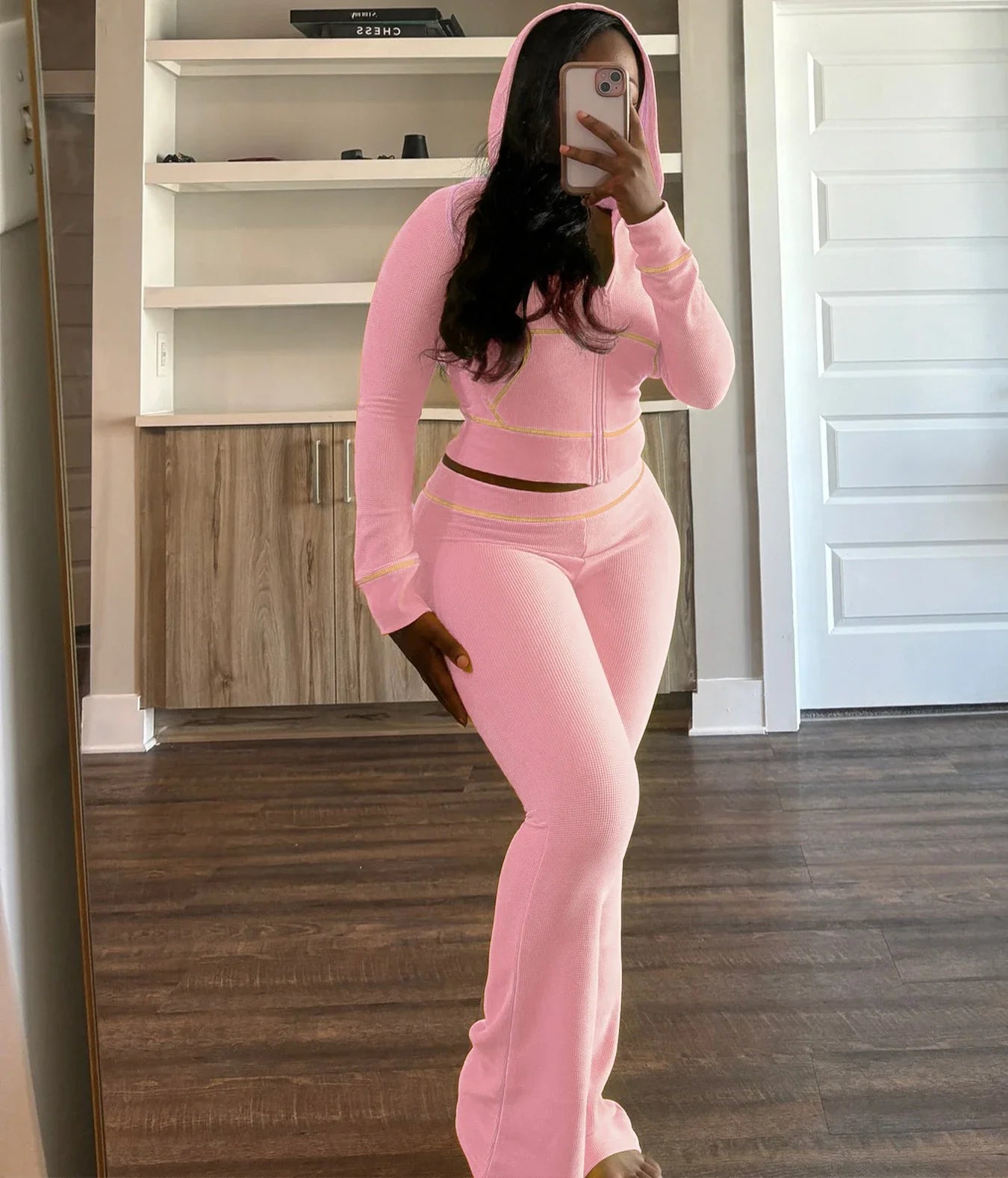 Waffle Texture Striped Women's Two Piece Sets Casual Long Sleeve Hooded Matching Set