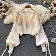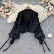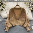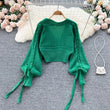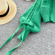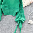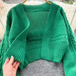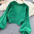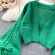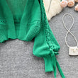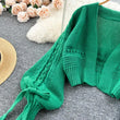 Green Casual Acrylic Knit V-Neck Lantern Long Sleeve Lace Up Women's Cardigan