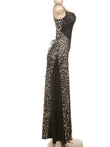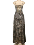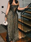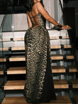 Women Leopard Panel Draped Backless Lace Up Sheath Long Robe Classic Party Dress