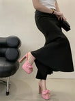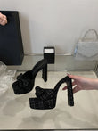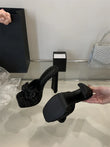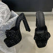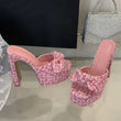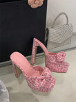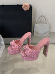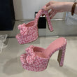 Pink Cloth Bowknot Square Toe Super High Heels Platform Slippers for Women