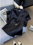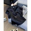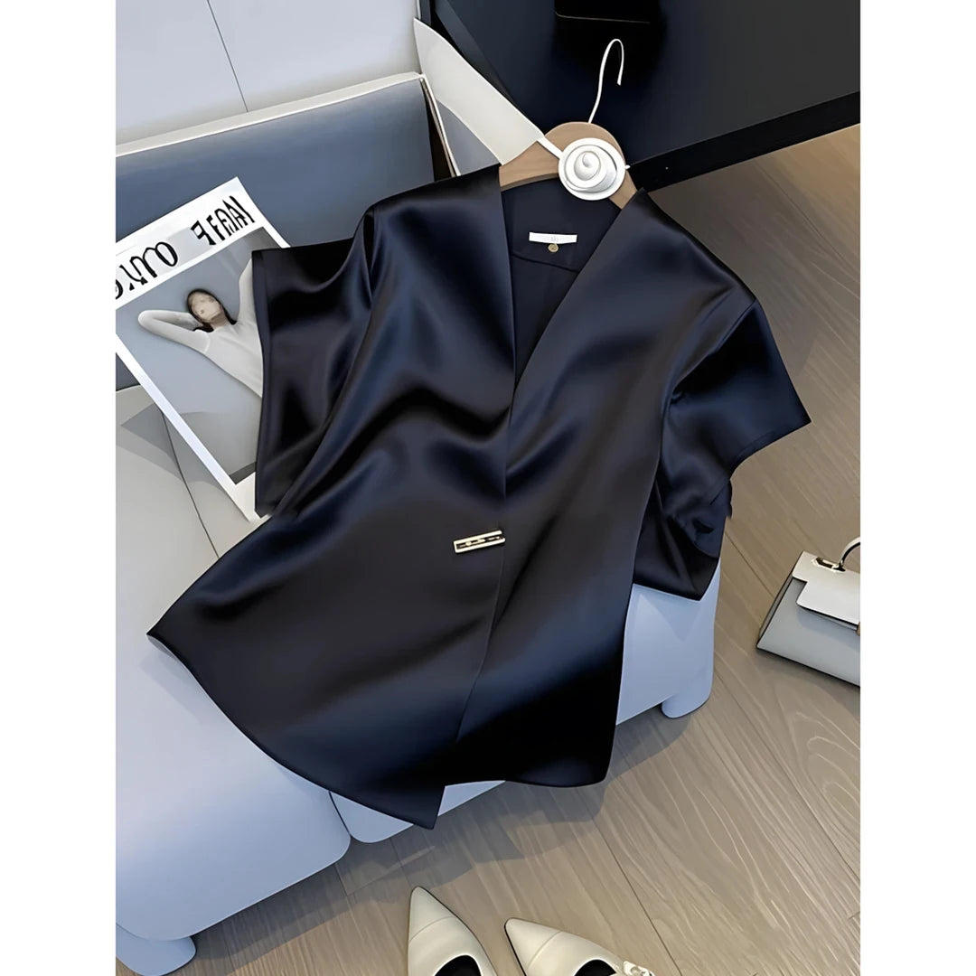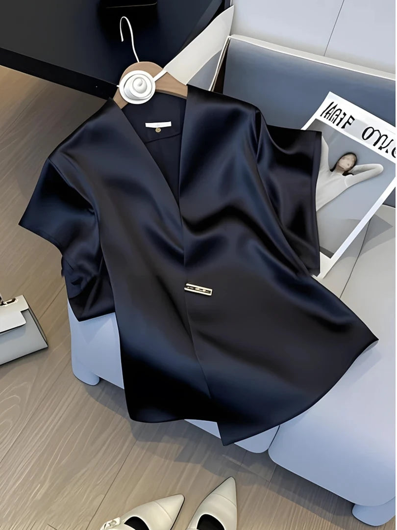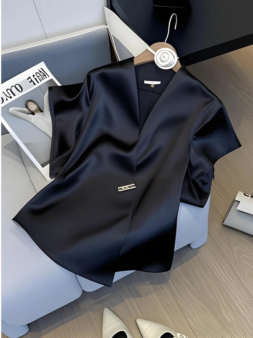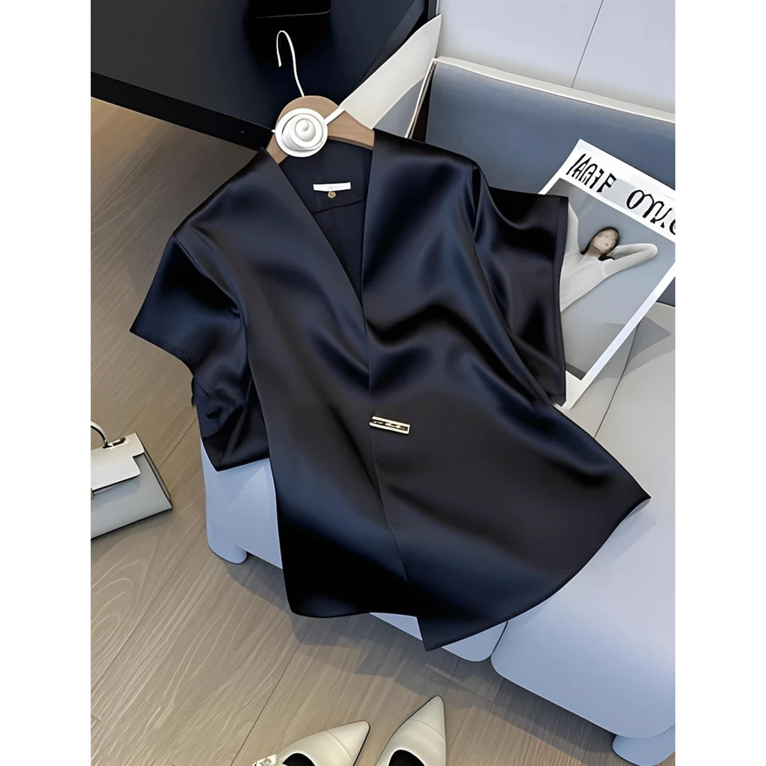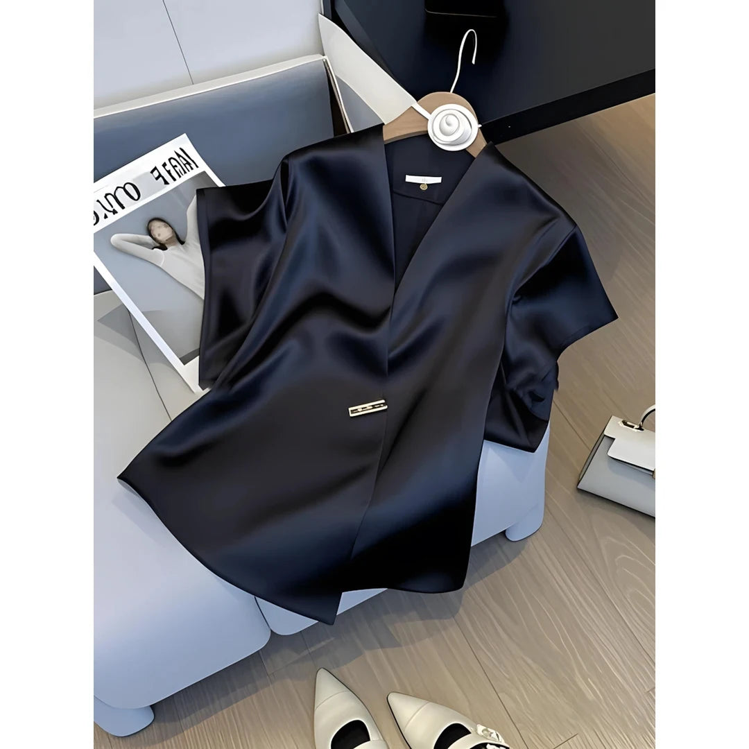 Satin Blouse Women Elegant V Neck Short Sleeve Loose Office Shirt