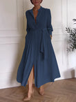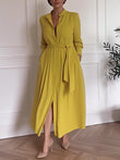 Women's Yellow Maxi Dress V-neck Tied Waist Long Sleeve Button Down Loose Casual Dress
