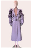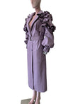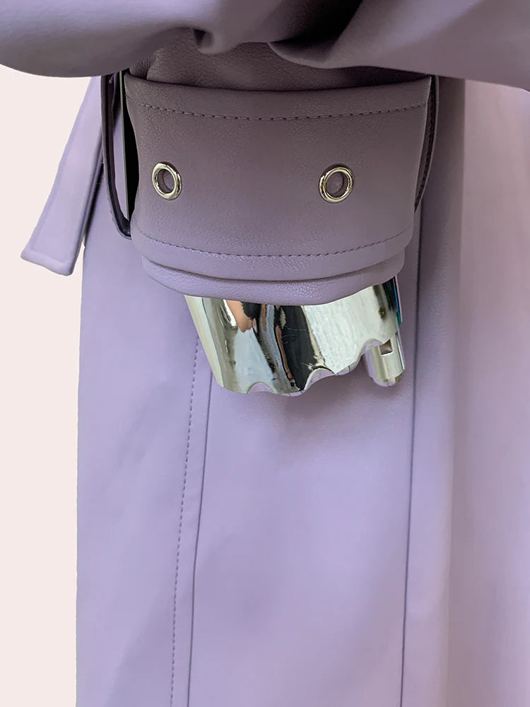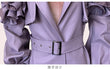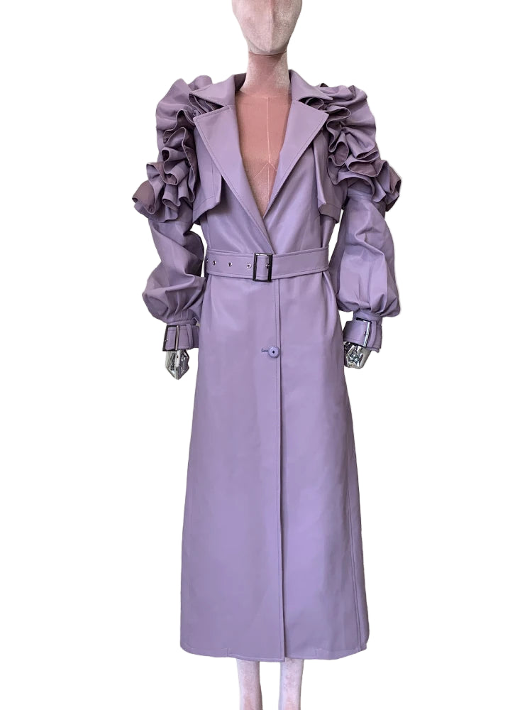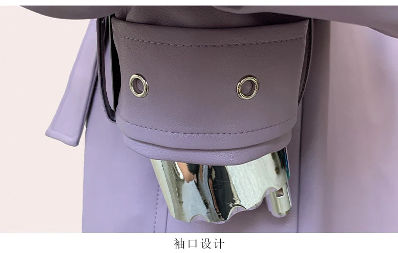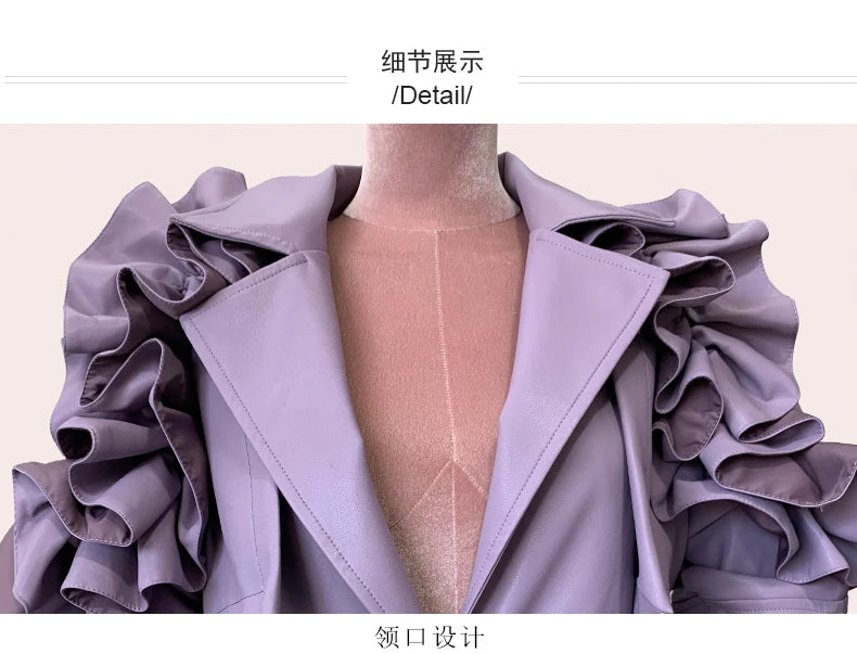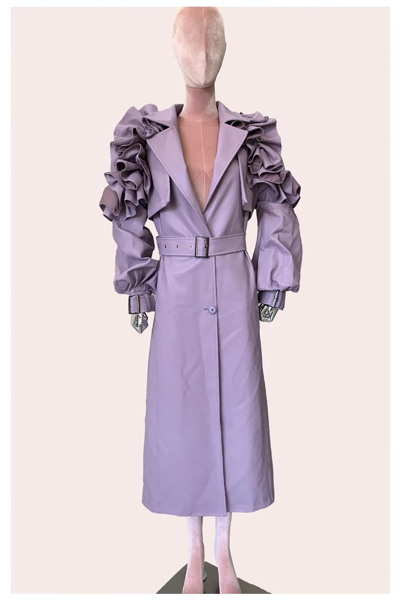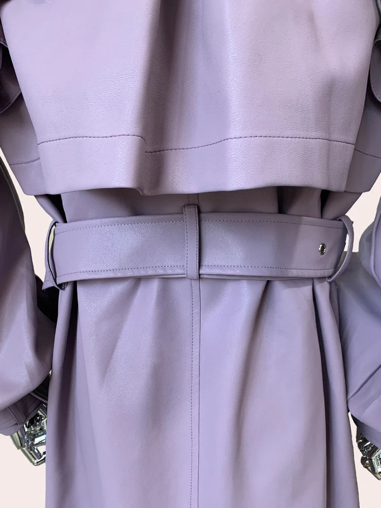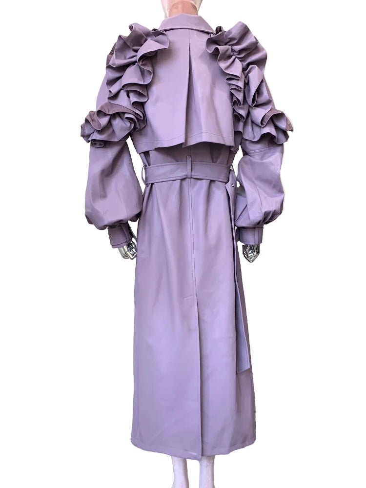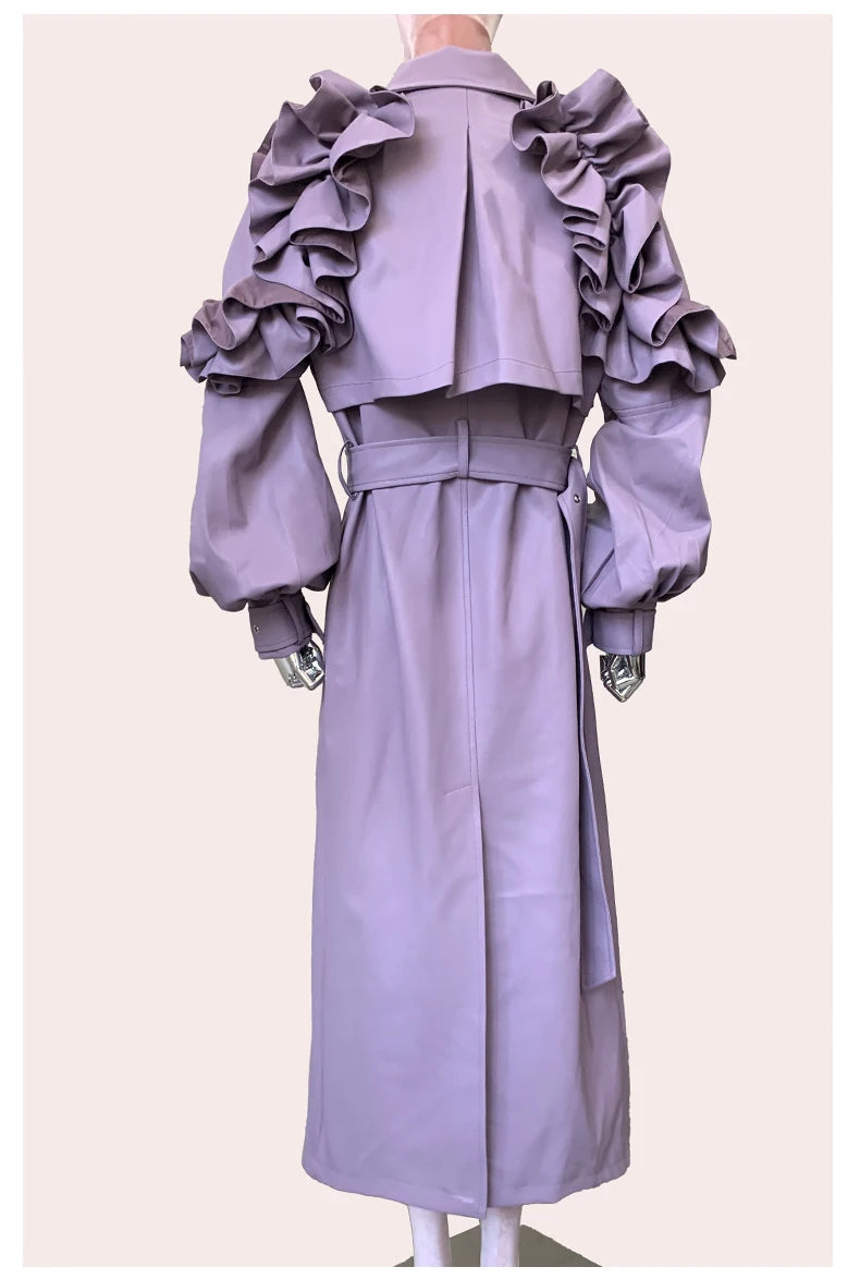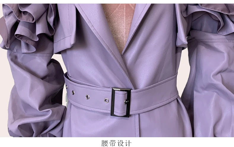 Autumn Long Ruffled Purple Pu Leather Trench Coat for Women