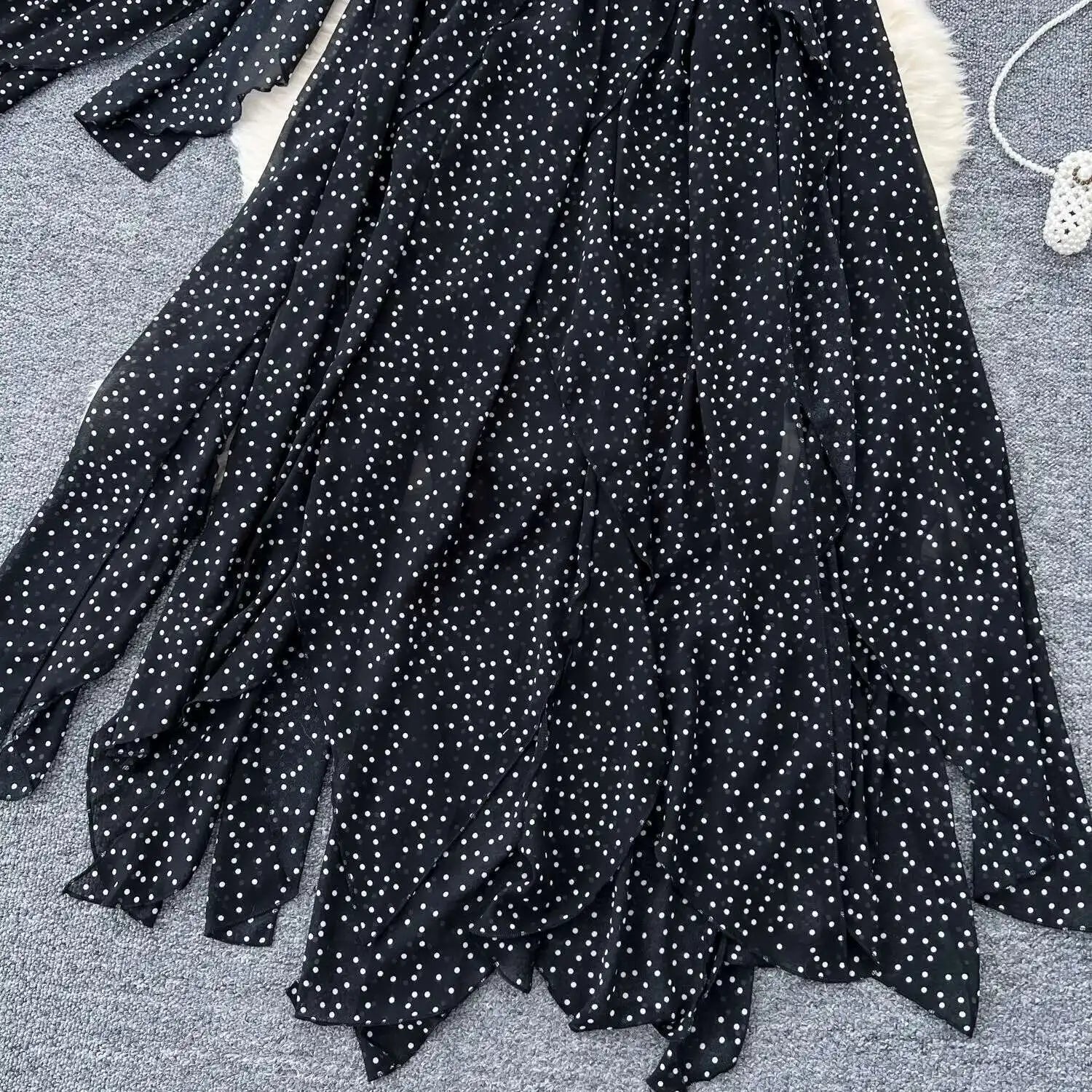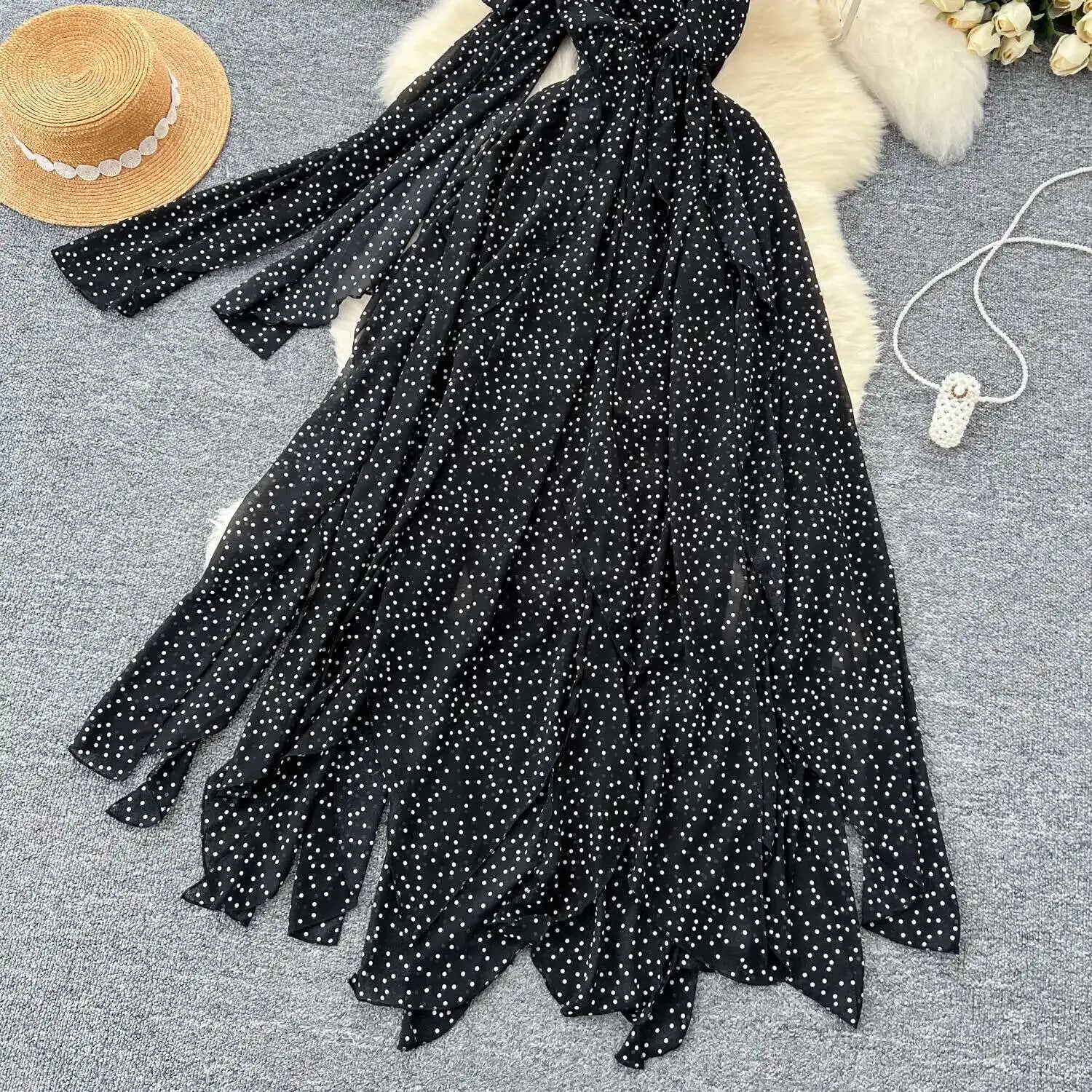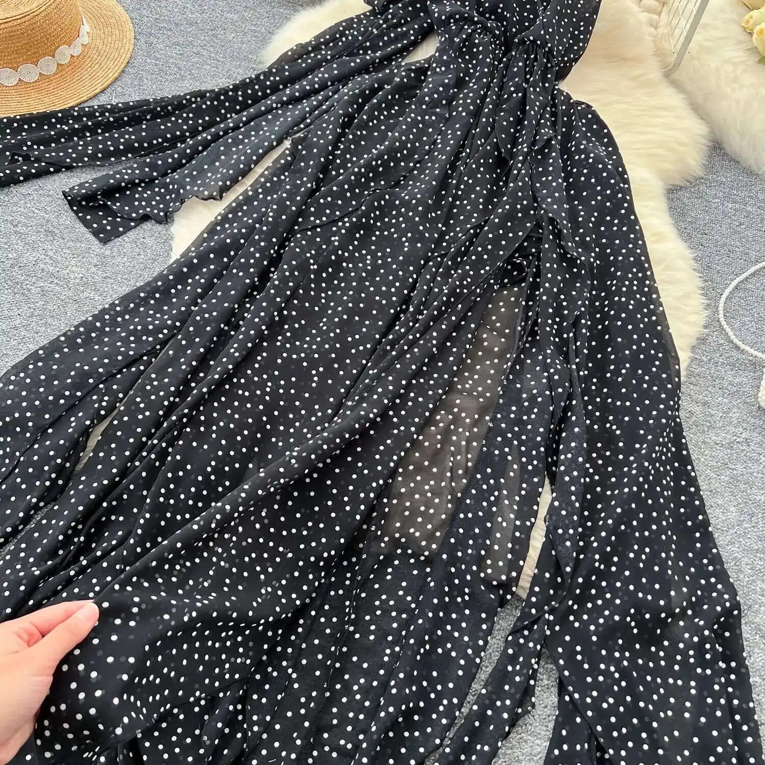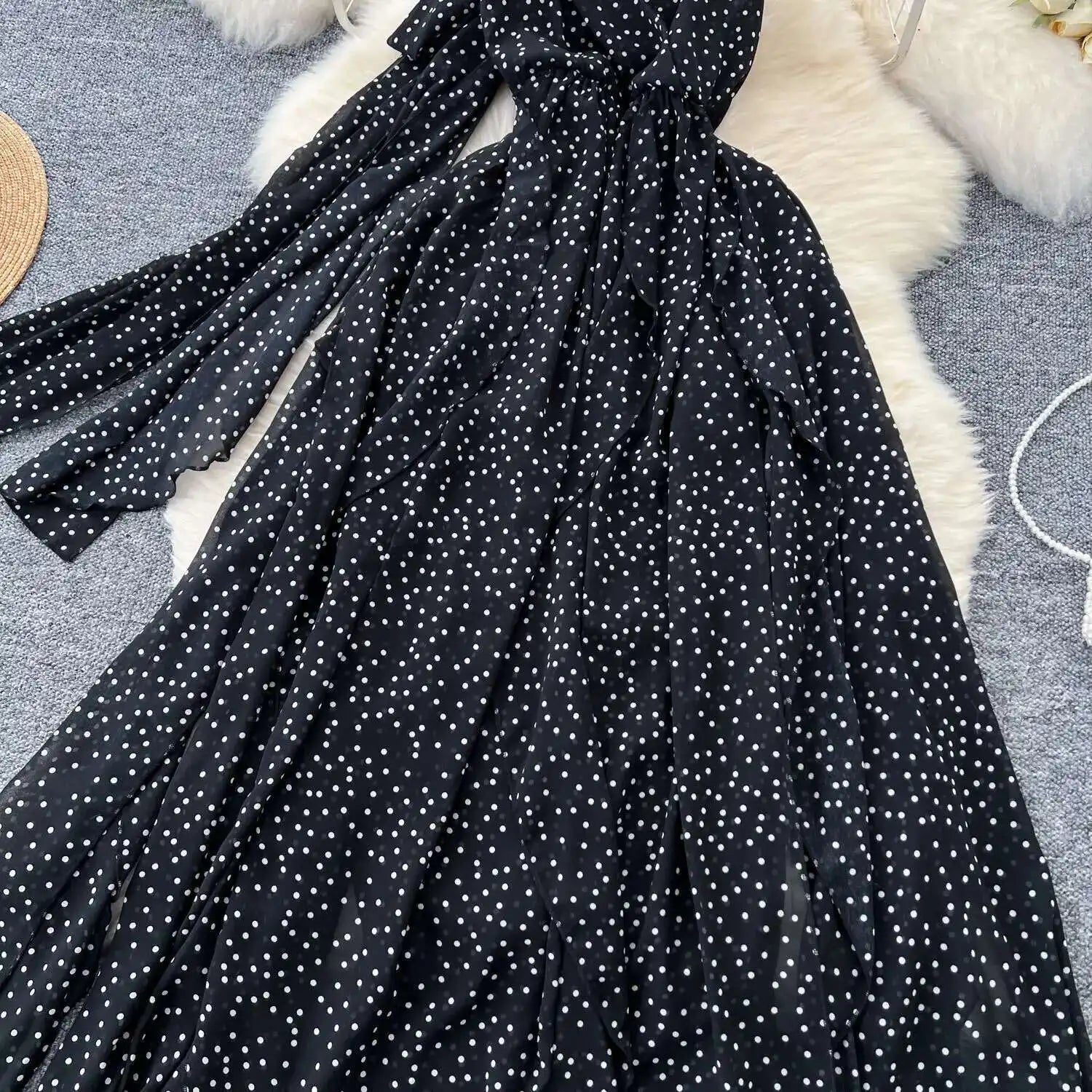 Runway Polka Dots Chiffon Dress Women Deep V Neck Long Maxi Dress