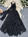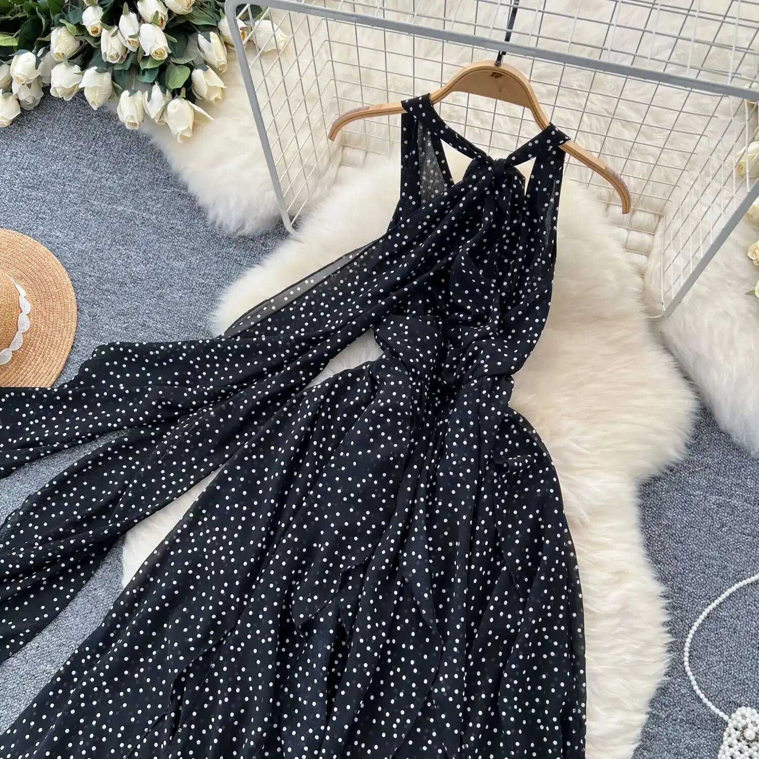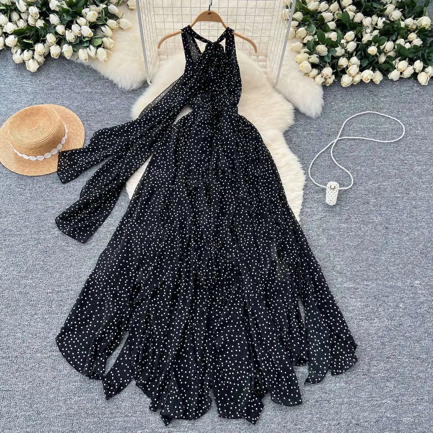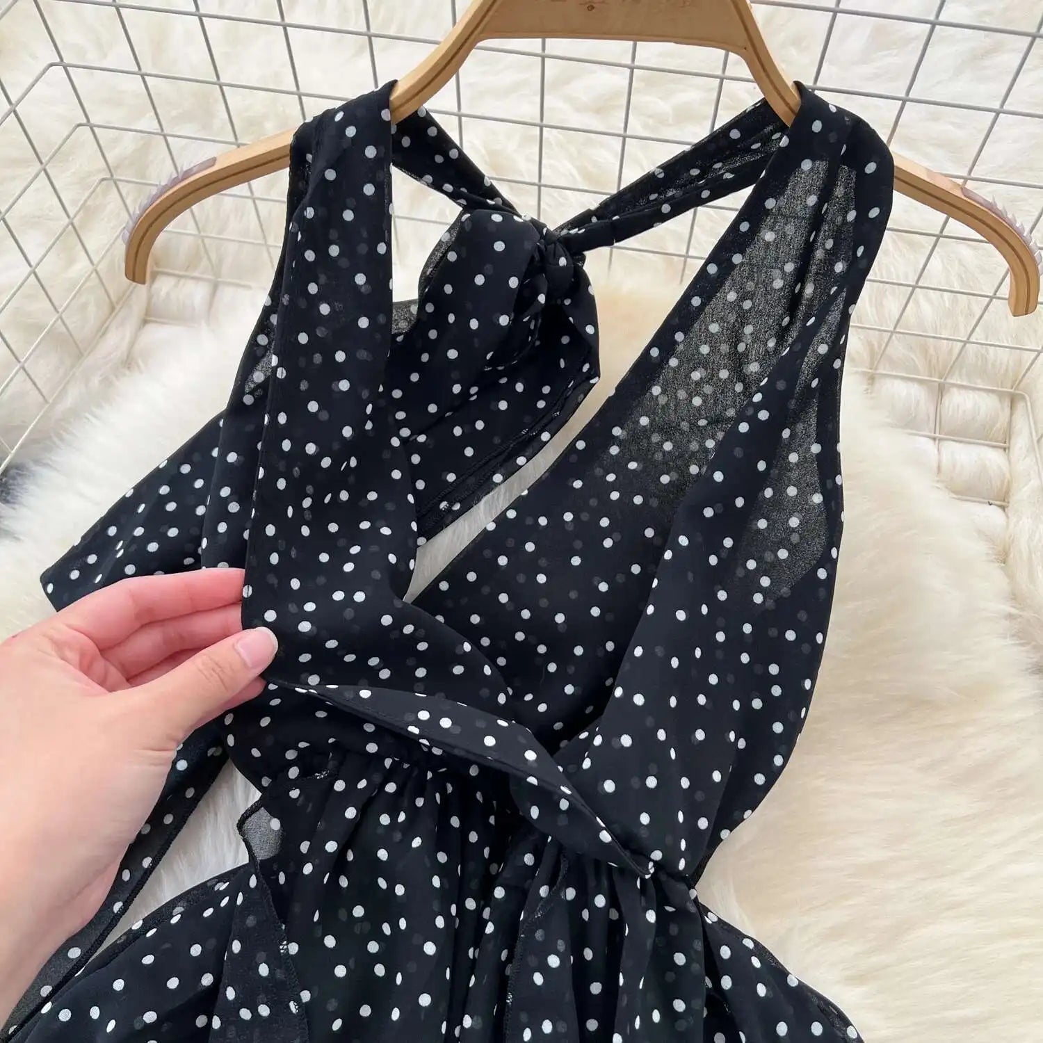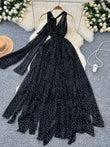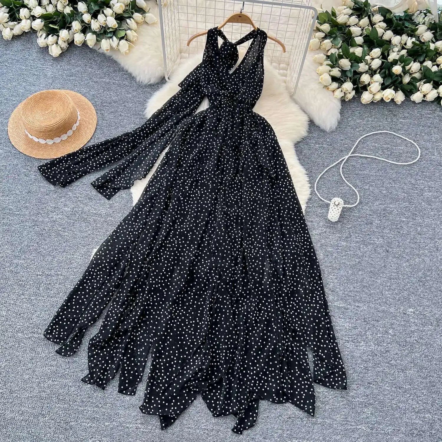 Runway Polka Dots Chiffon Dress Women Deep V Neck Long Maxi Dress
