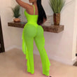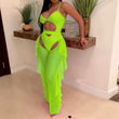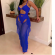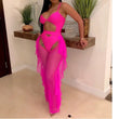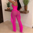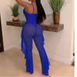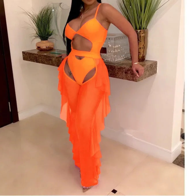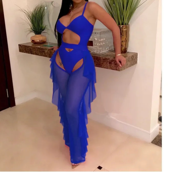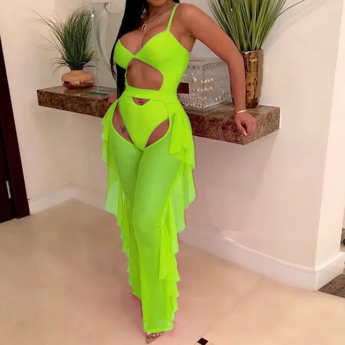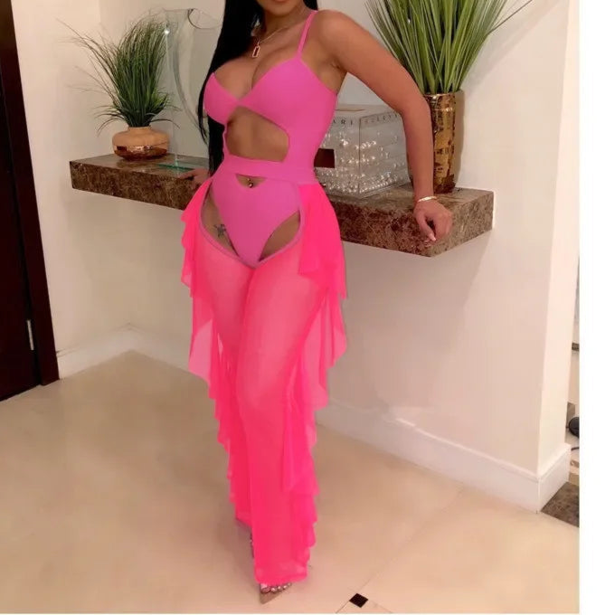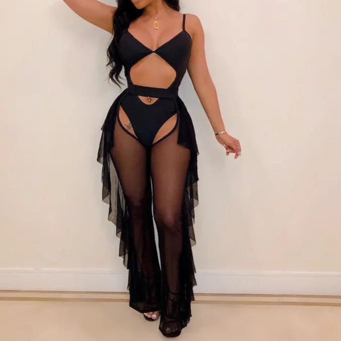 Hollow Out 2 Pieces Set for Woman Mesh See Through Bodysuit Top and Ruffles Pants Swimsuit Outfit