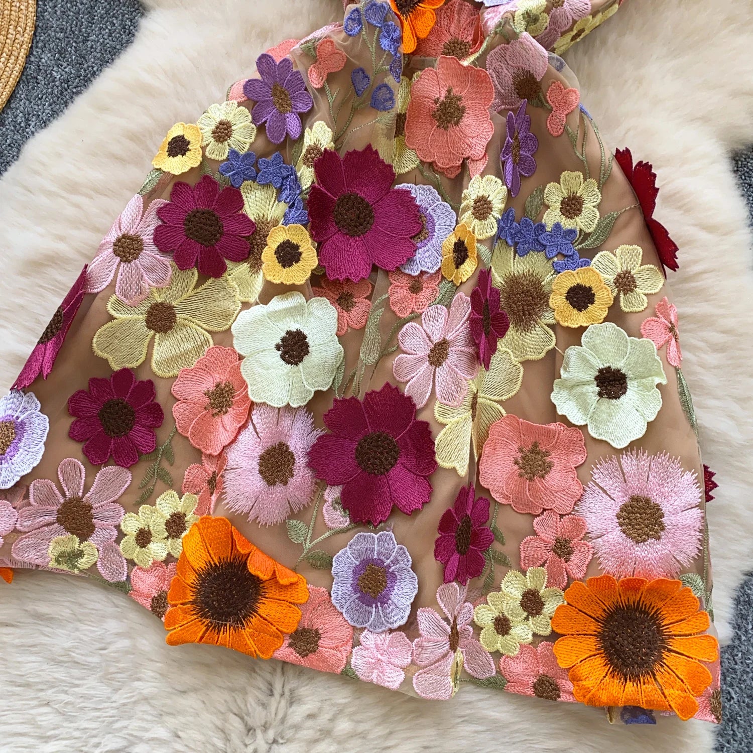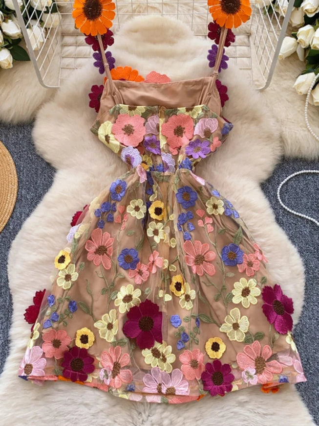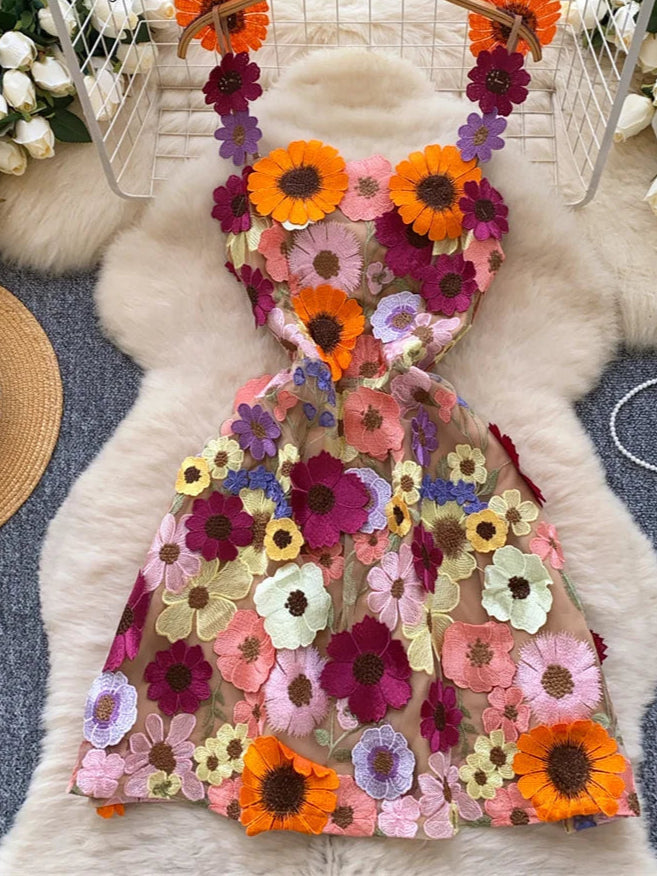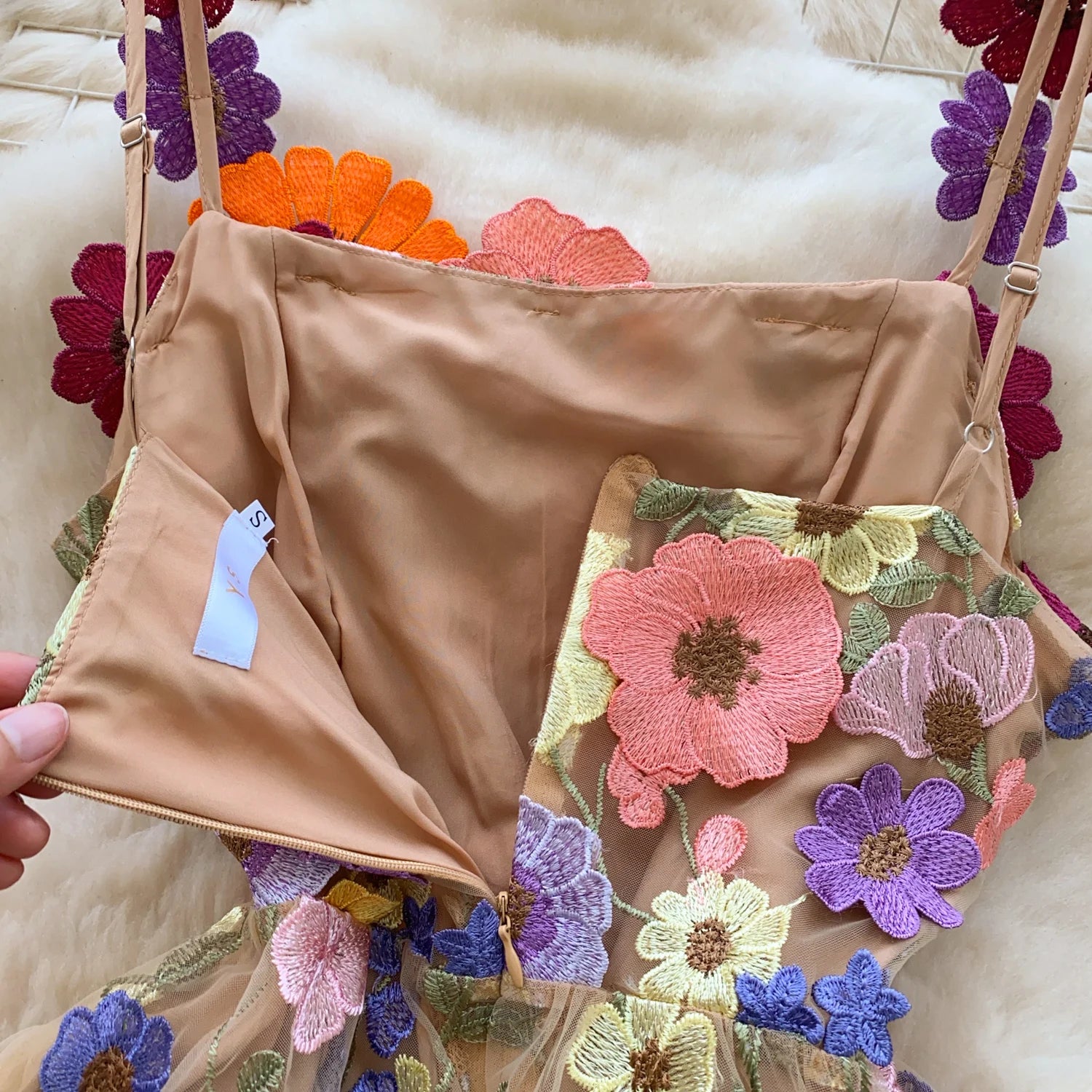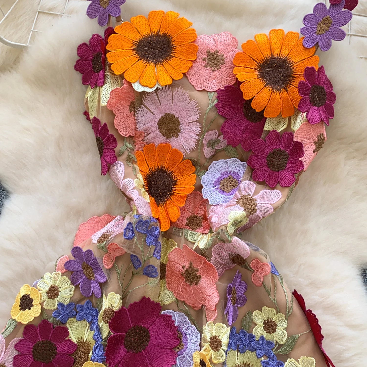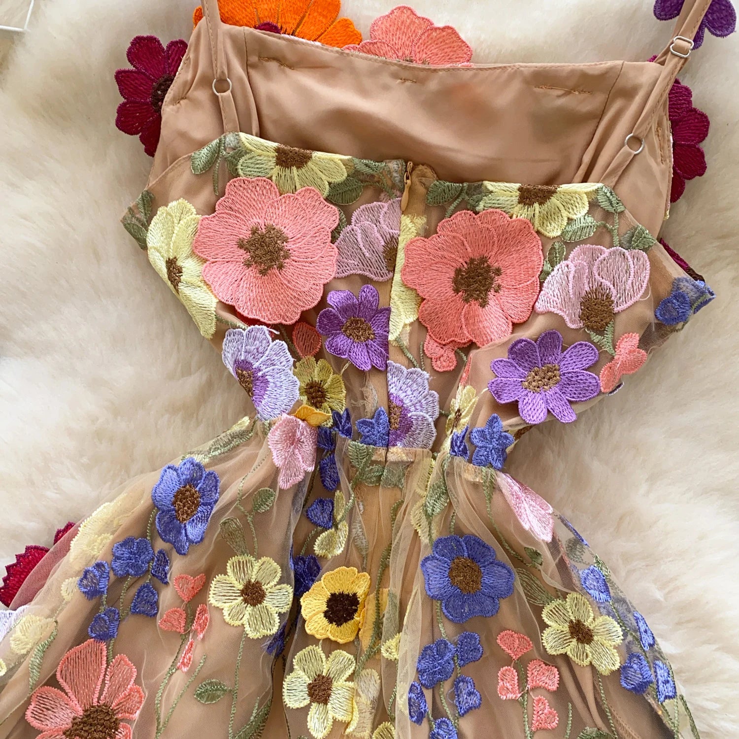 Chic Embroidery Strap Dress Women Sleeveless Zipper 3D Floral Design Summer Evening Dress