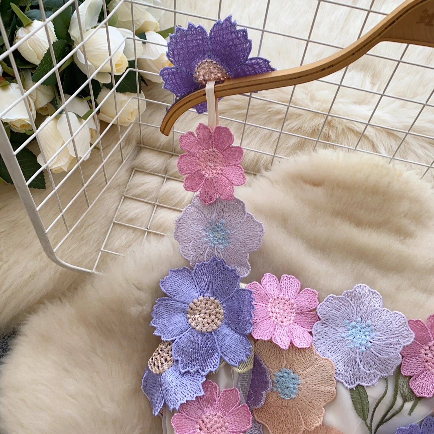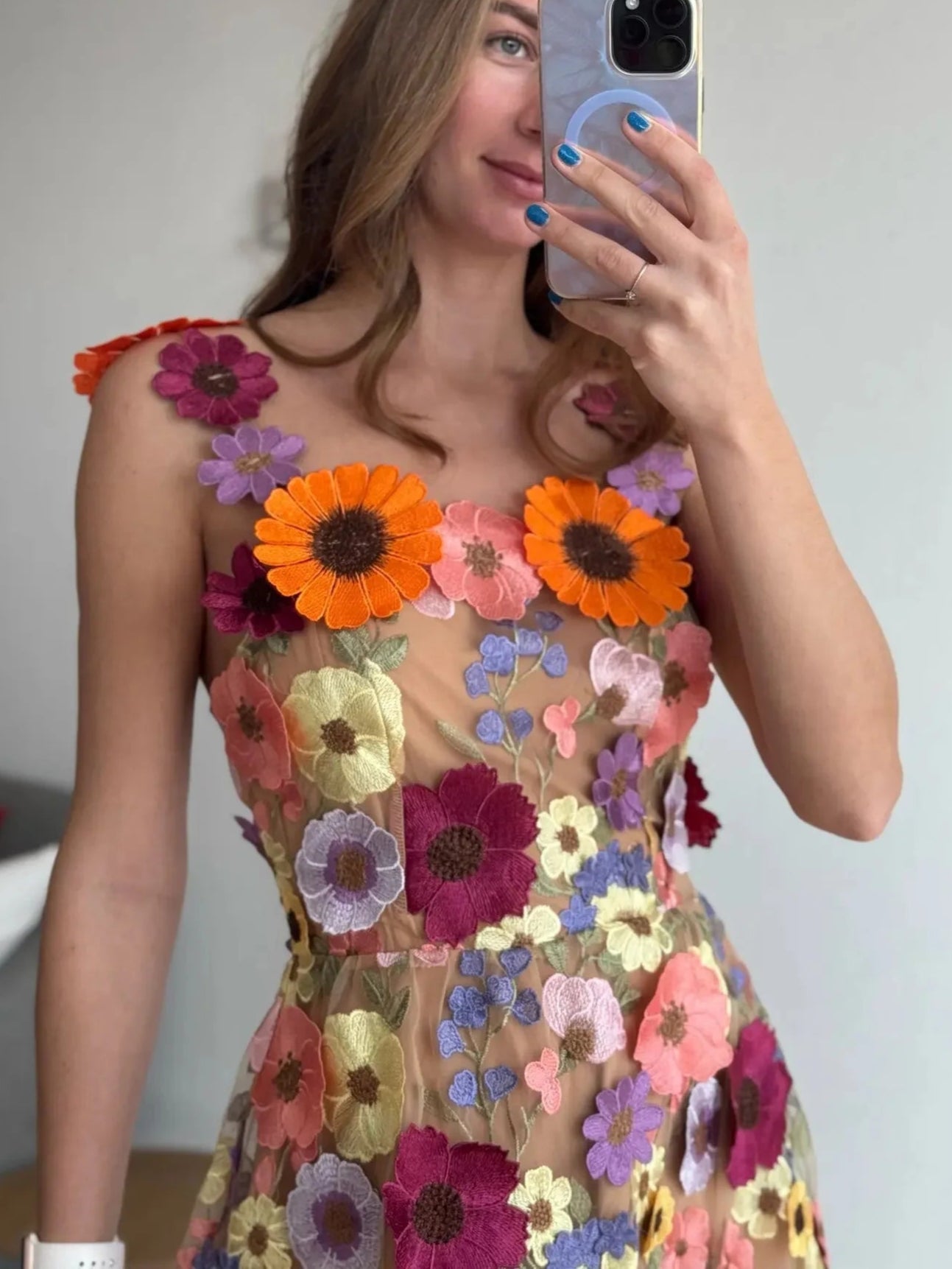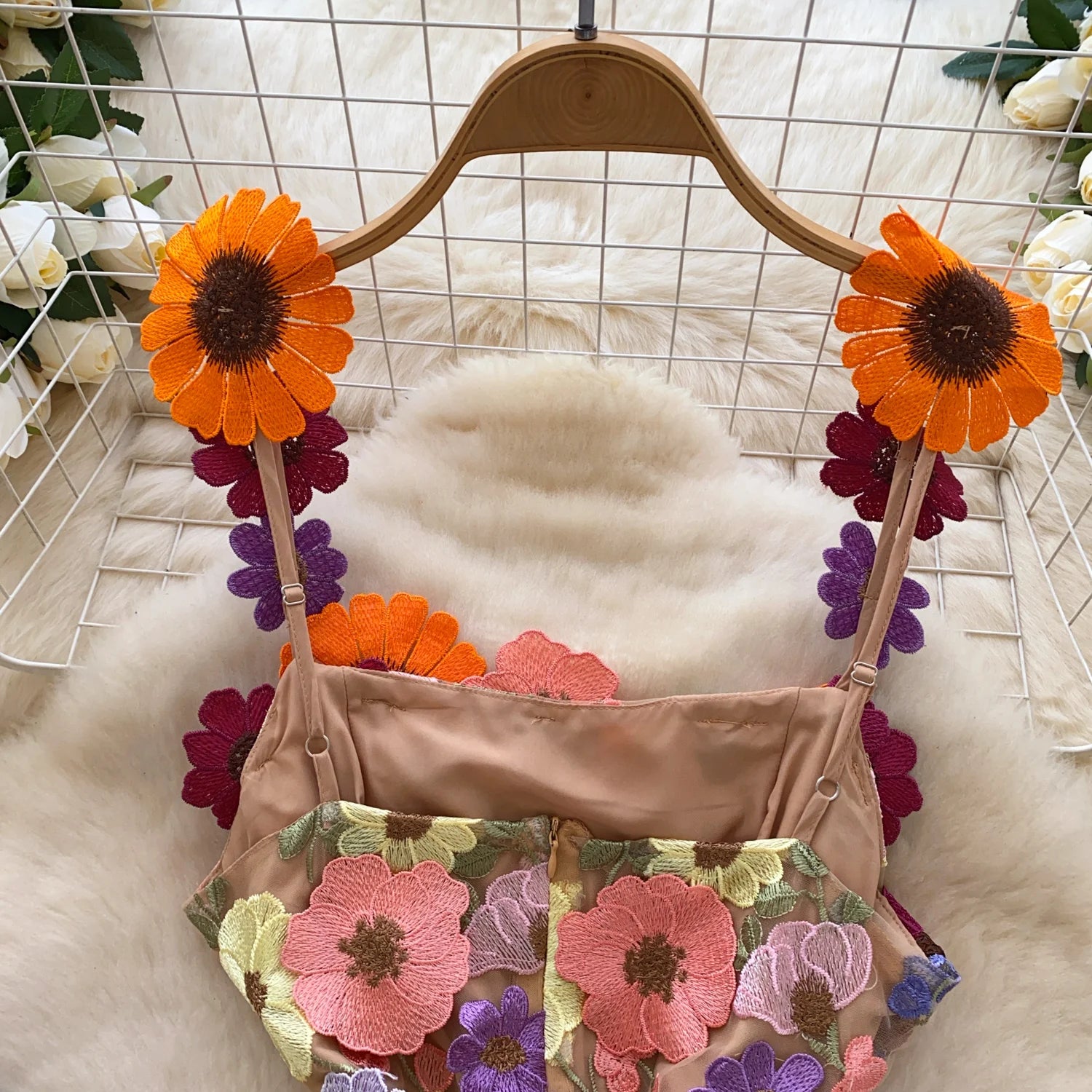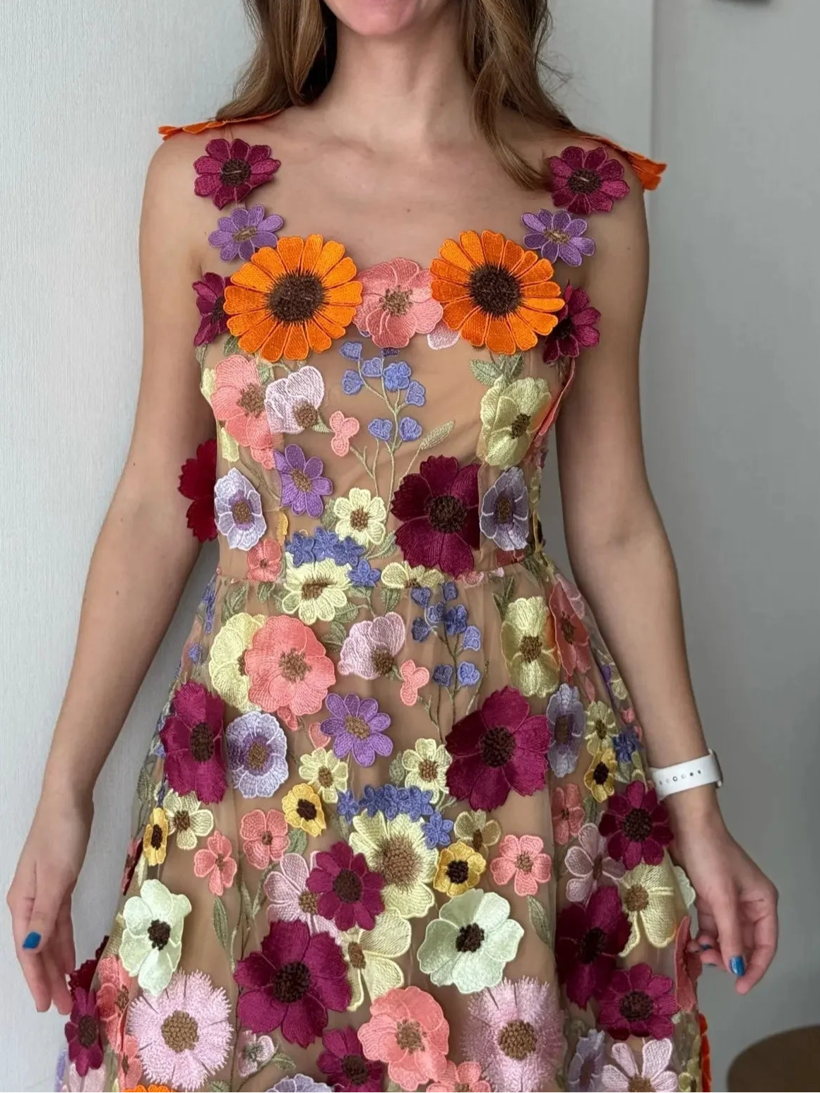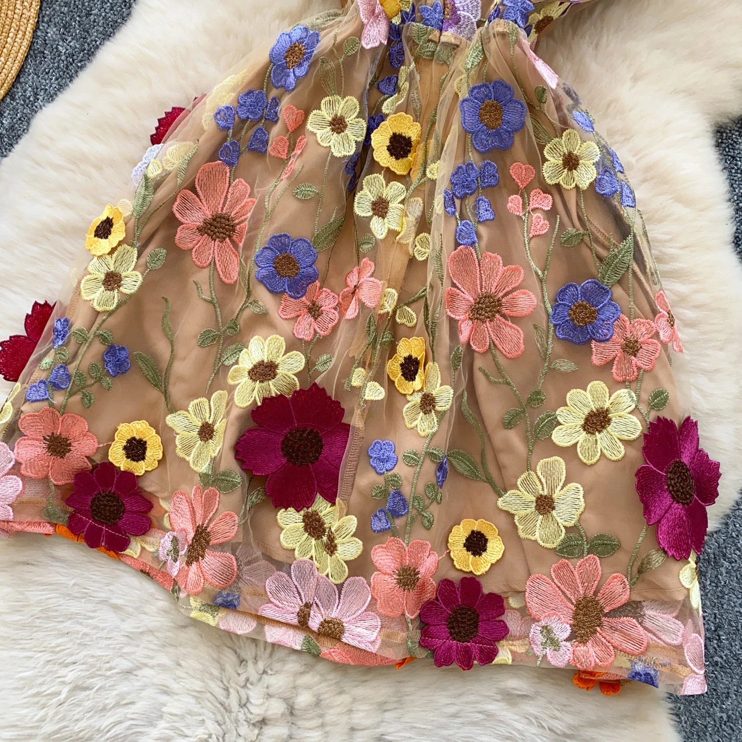 Chic Embroidery Strap Dress Women Sleeveless Zipper 3D Floral Design Summer Evening Dress