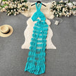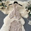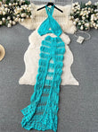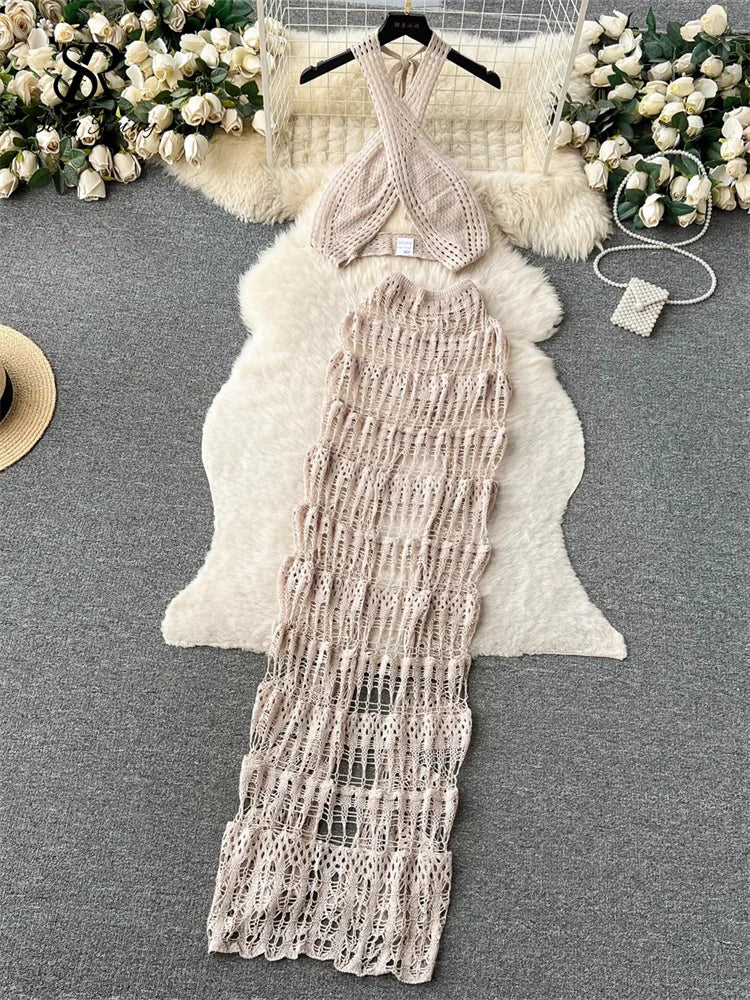 Hollow Out Female Beach Suits Fashion Cross Halter Camis+Split Long Skirt Two Piece Set Vacation Sets