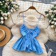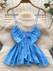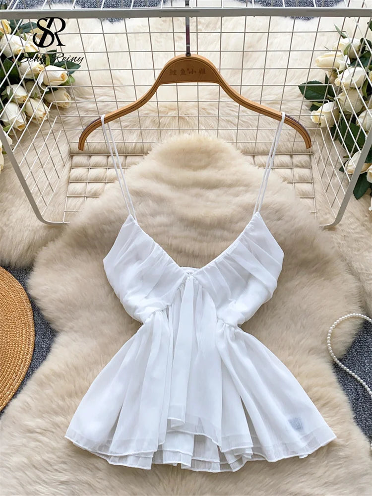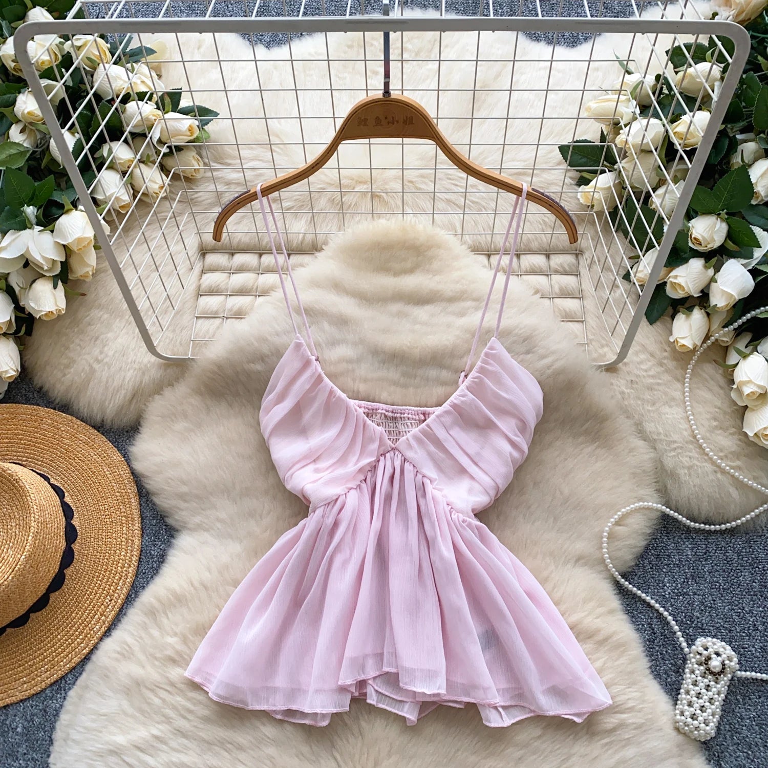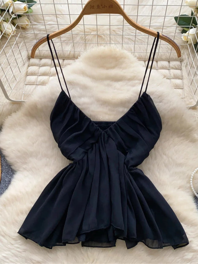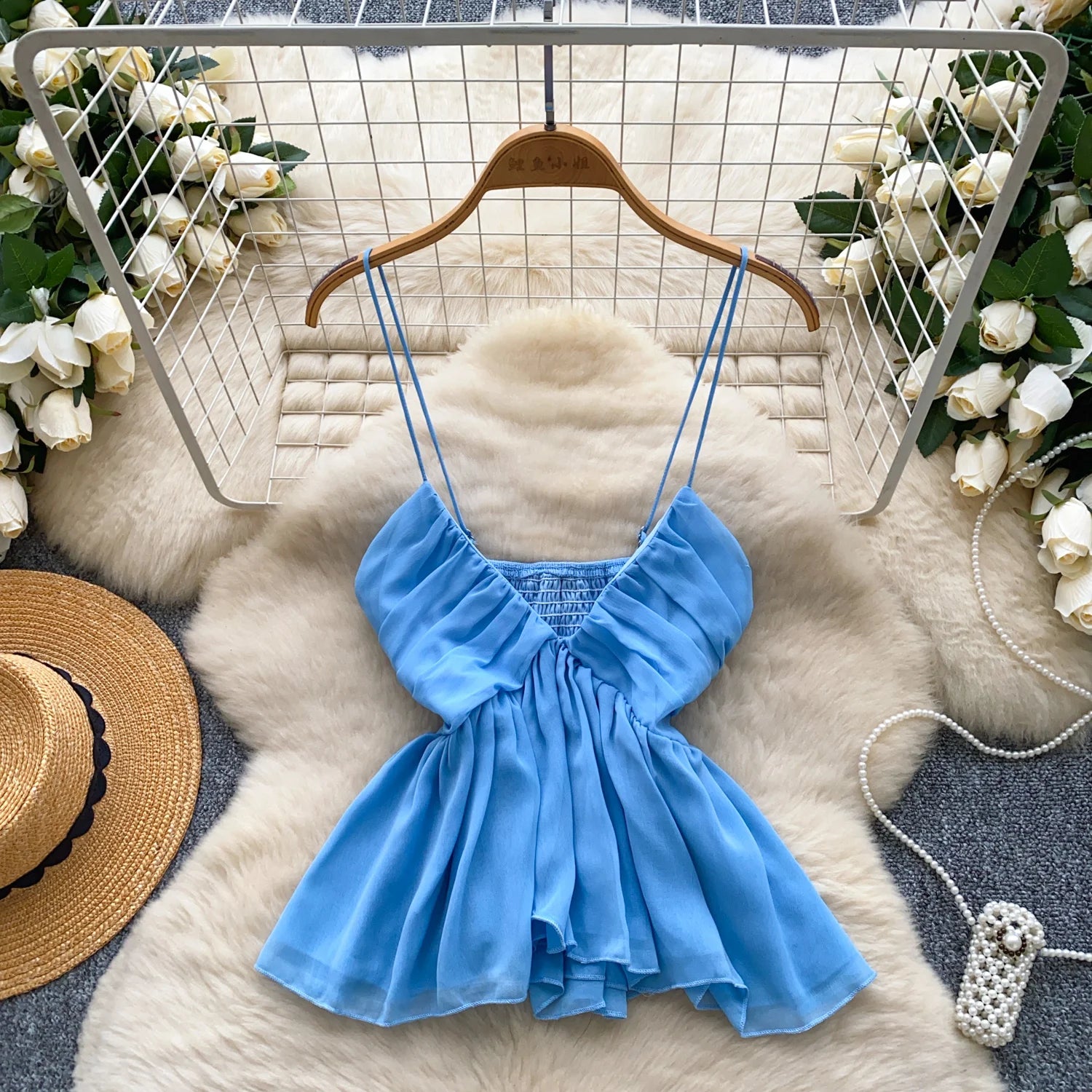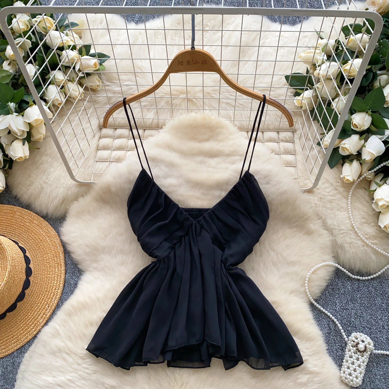 Chiffon Tops Straps Deep V Backless Top Ruffles Short Tank Top Vacation Style Sexy Tops