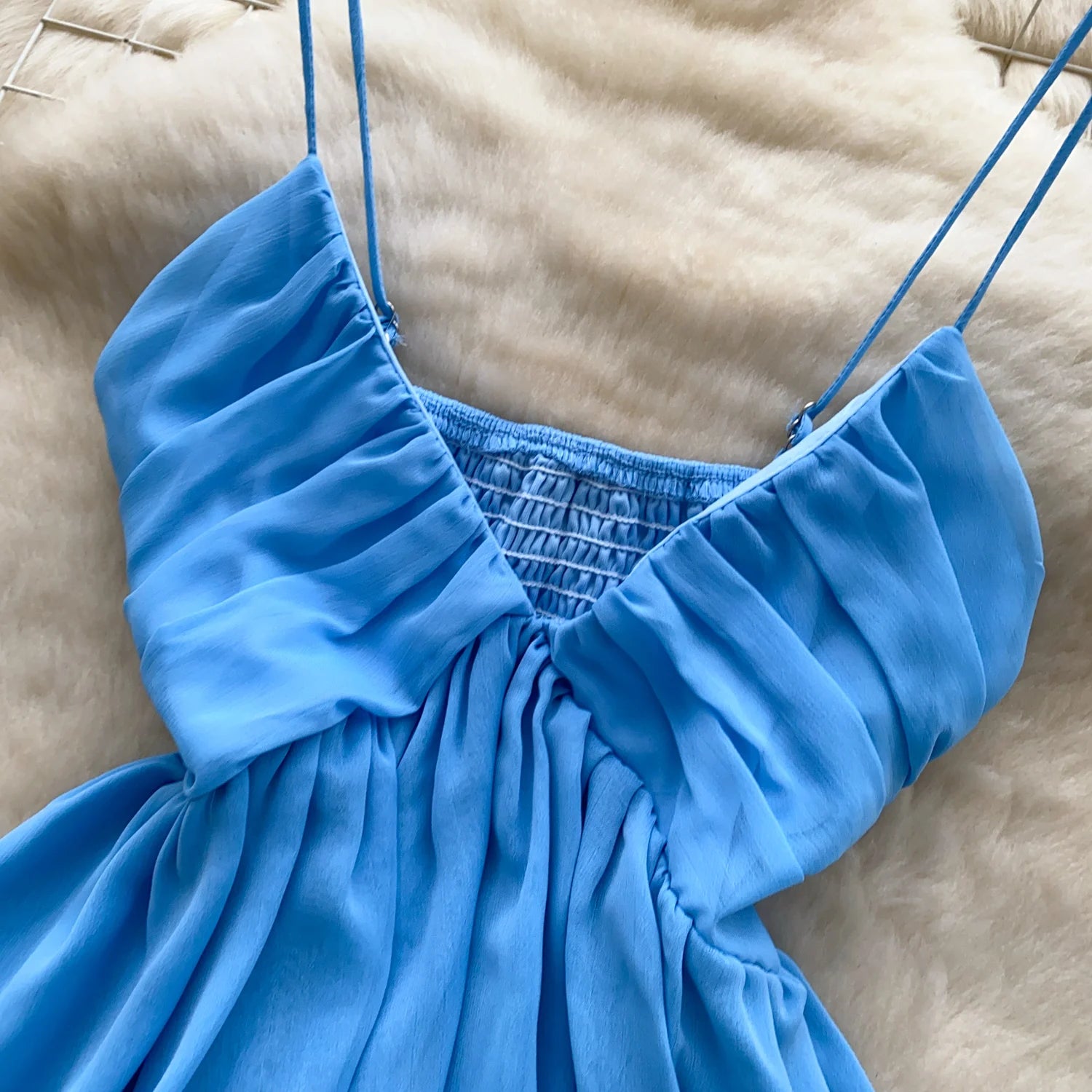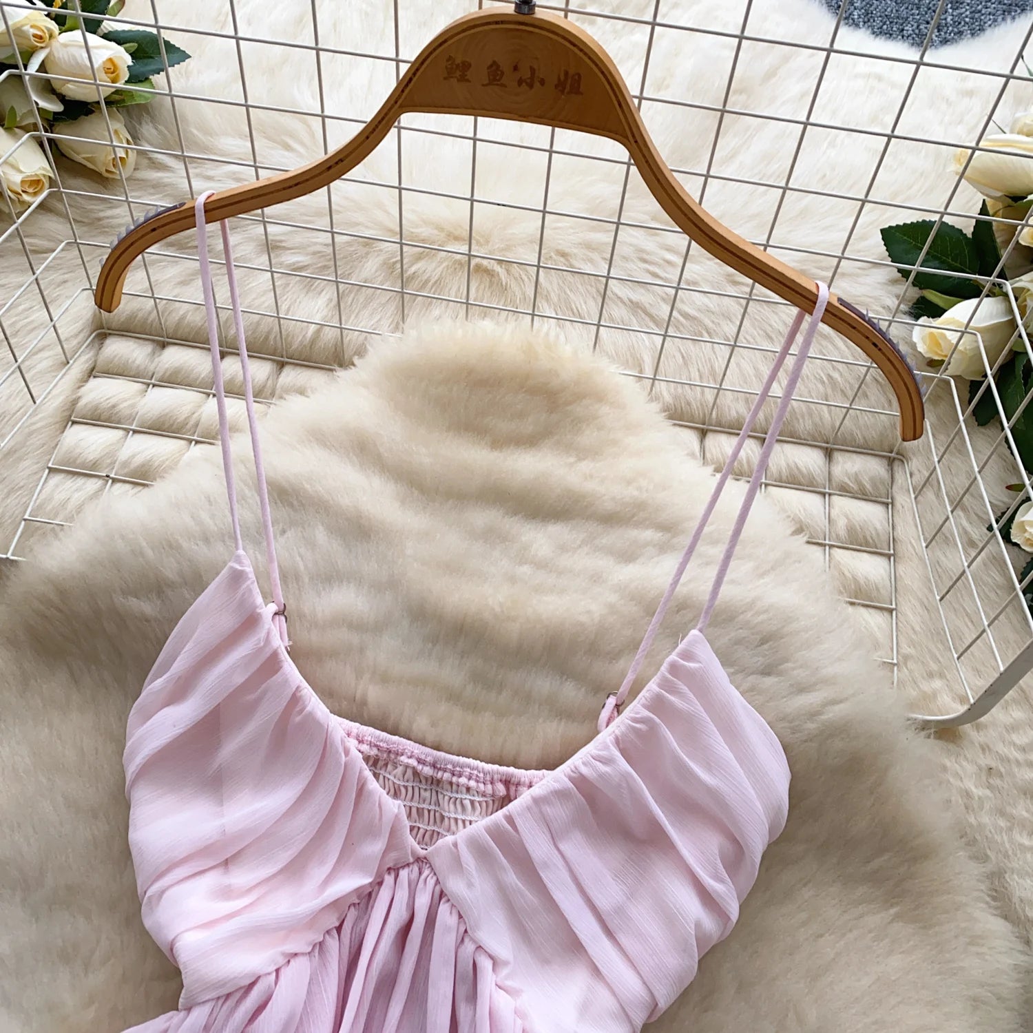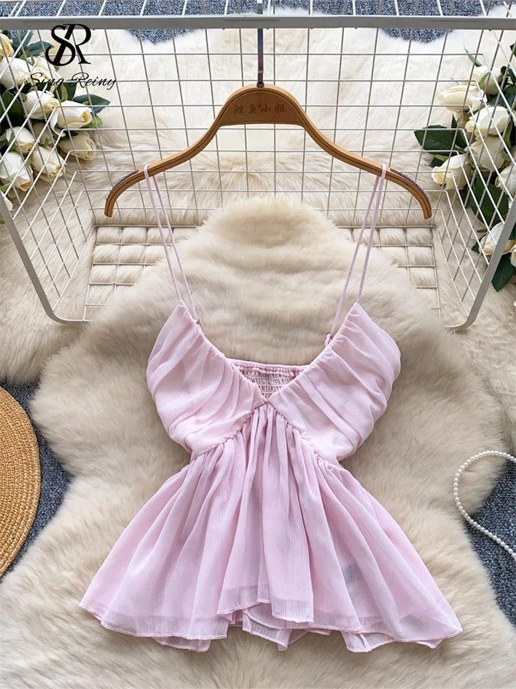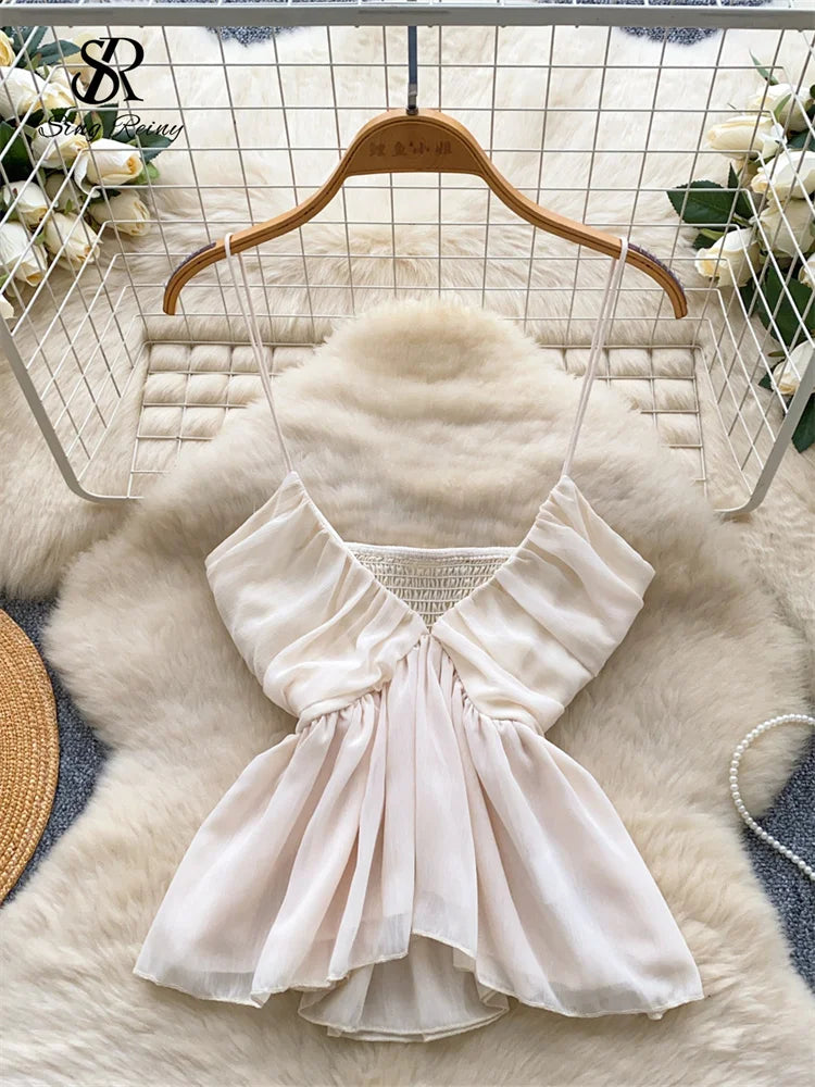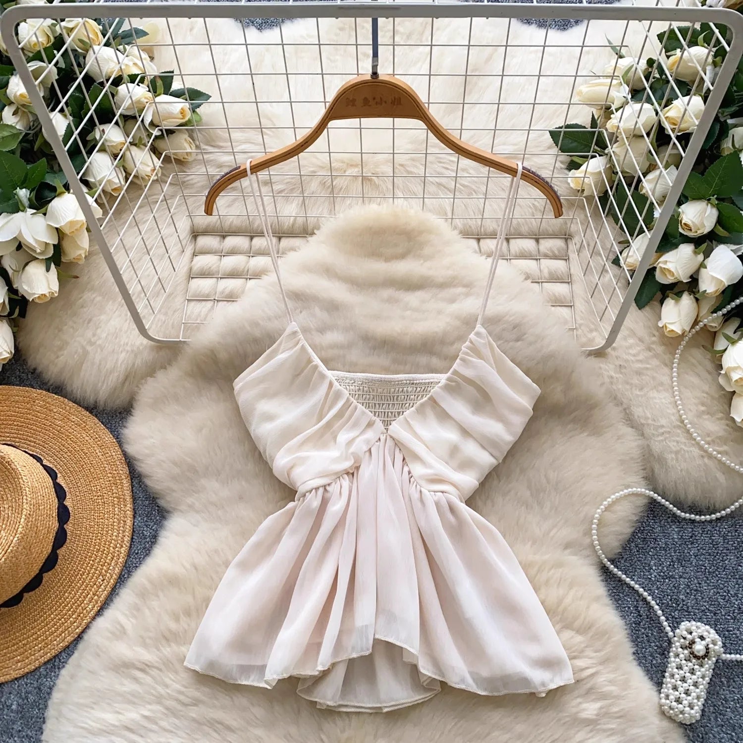 Chiffon Tops Straps Deep V Backless Top Ruffles Short Tank Top Vacation Style Sexy Tops