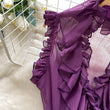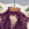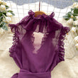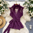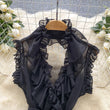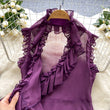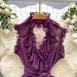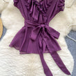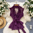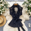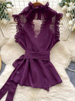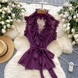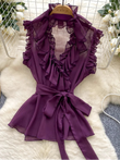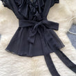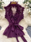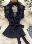 Sweet Ruffles Chiffon Blouses Women Sleeveless V Neck Retro Lace Up Blouse