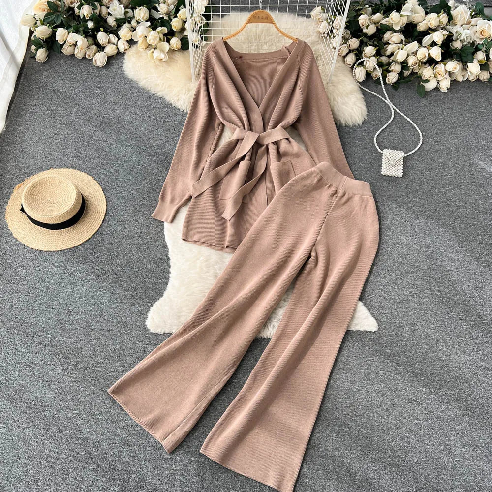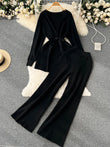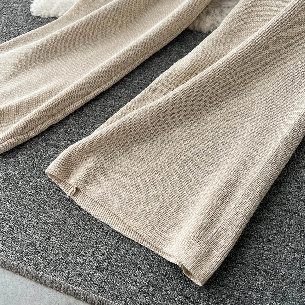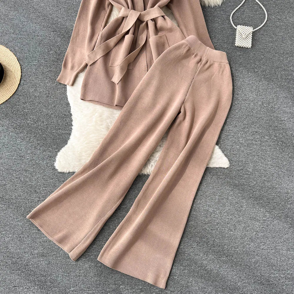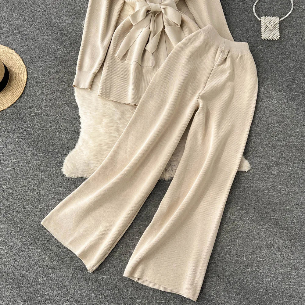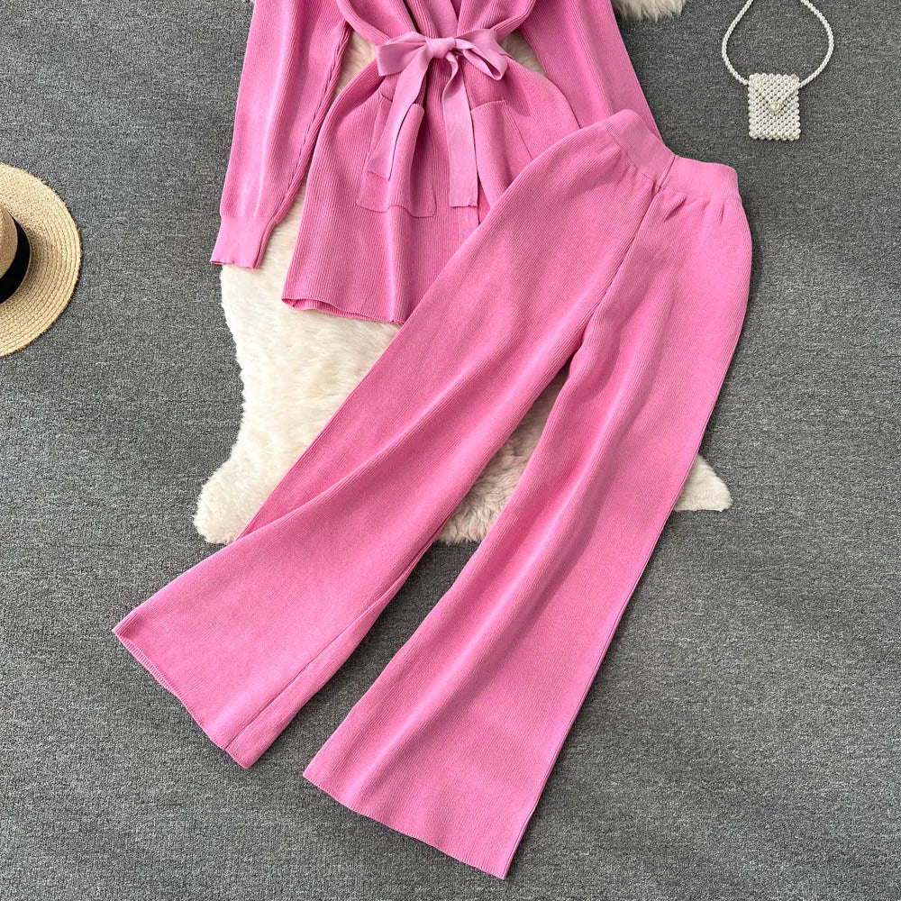 Casual Two Pieces Suits Long Sleeve Knitted Cardigan Coat+Elastic Waist Wide Leg Pants