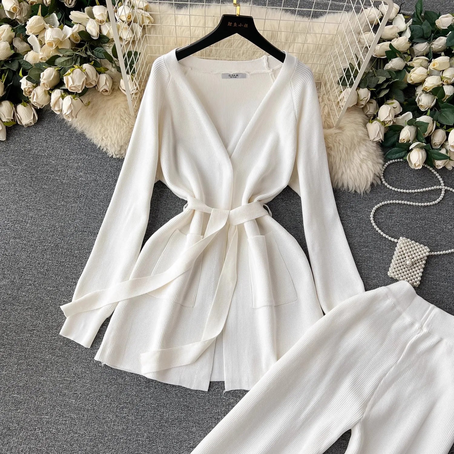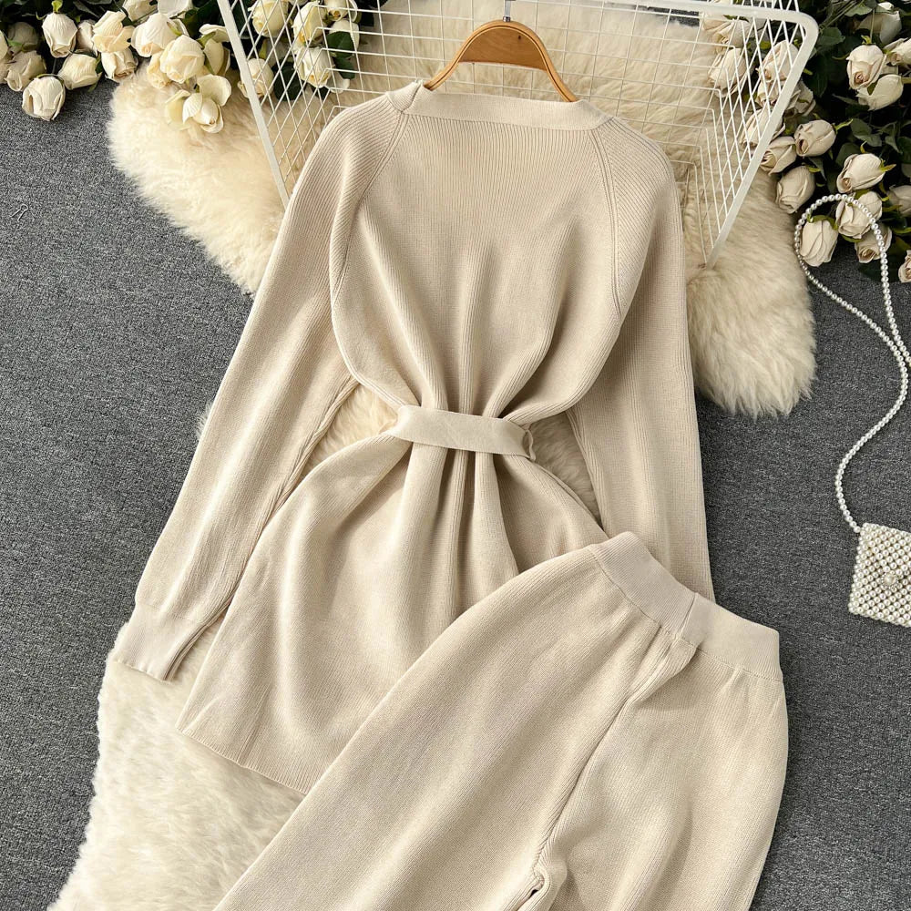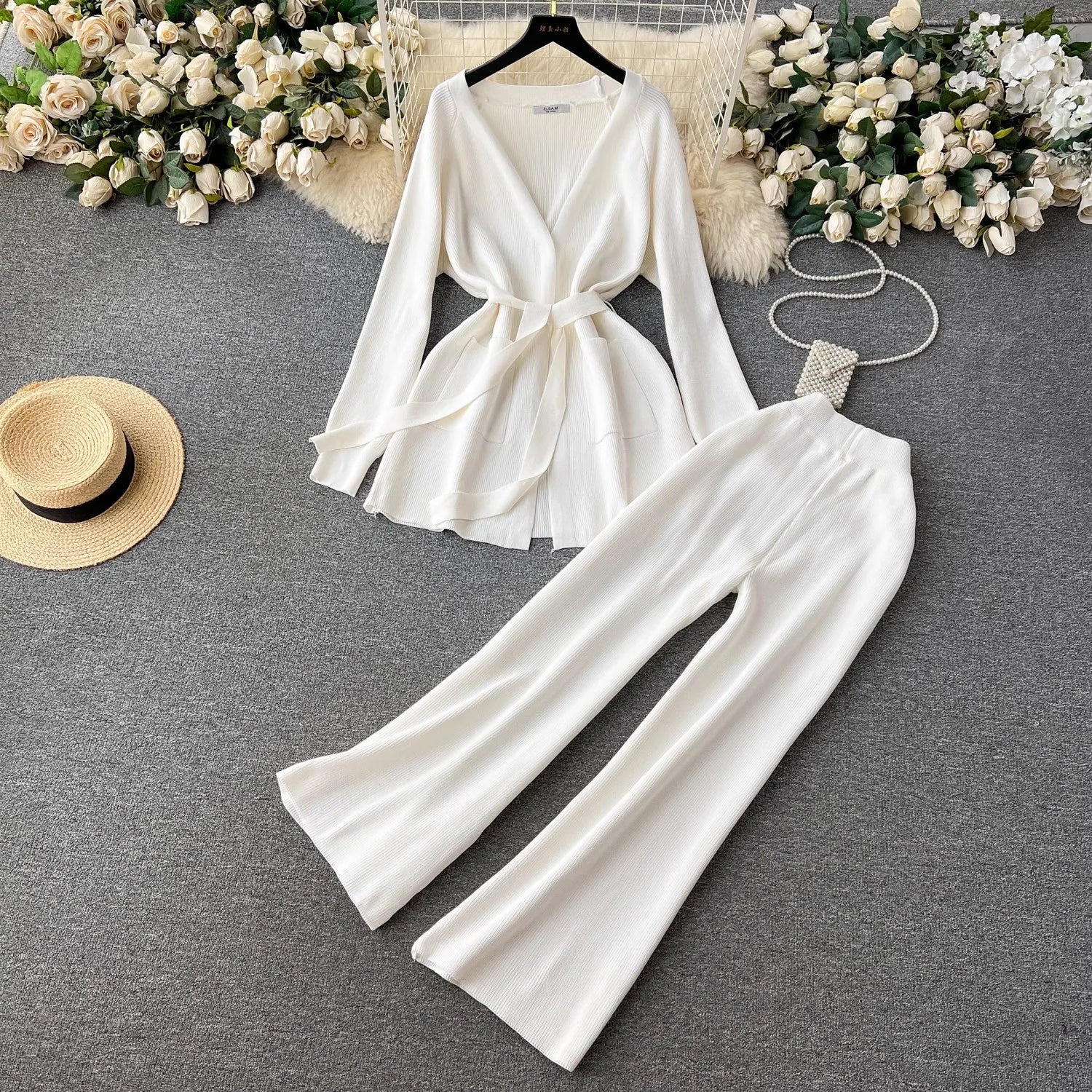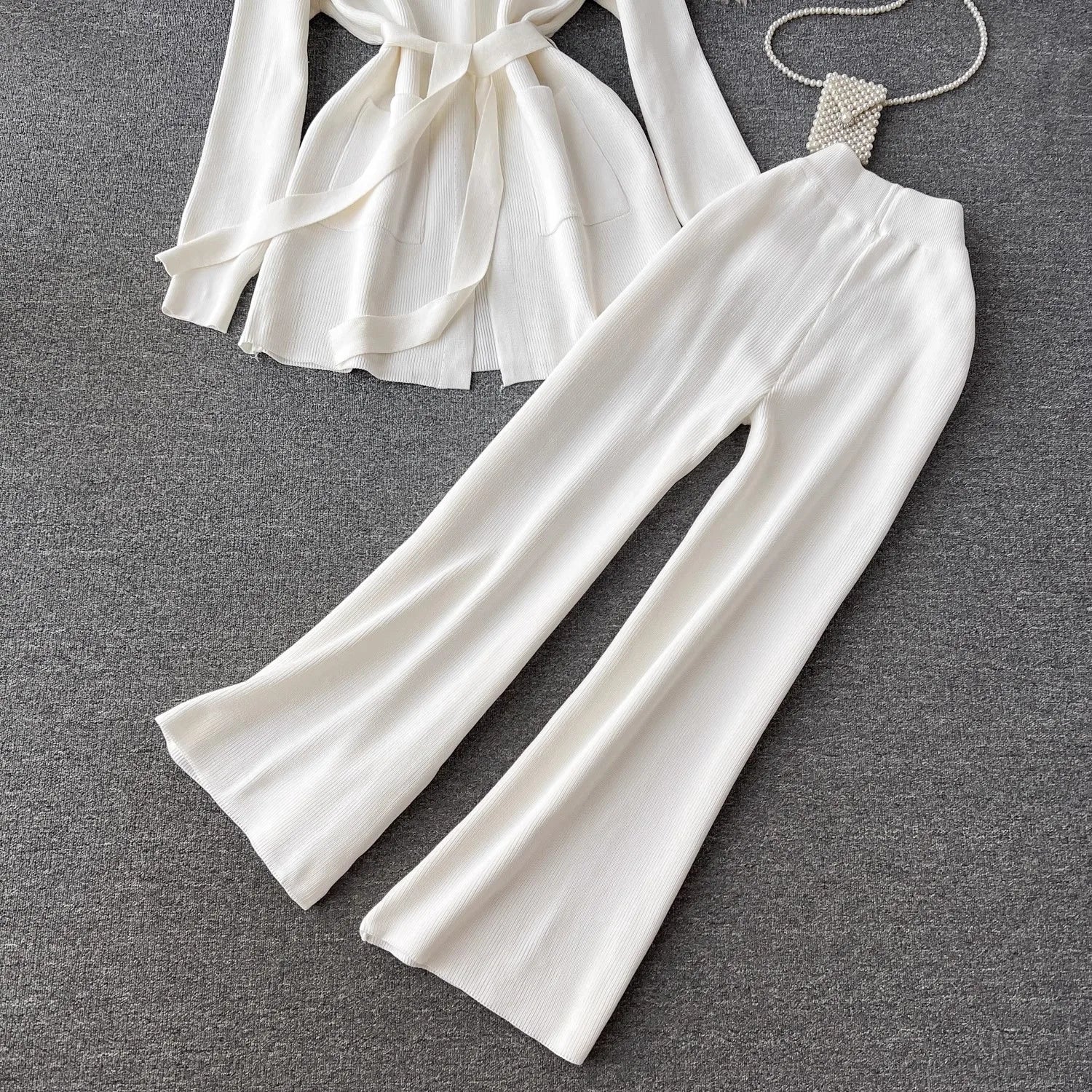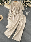 Casual Two Pieces Suits Long Sleeve Knitted Cardigan Coat+Elastic Waist Wide Leg Pants