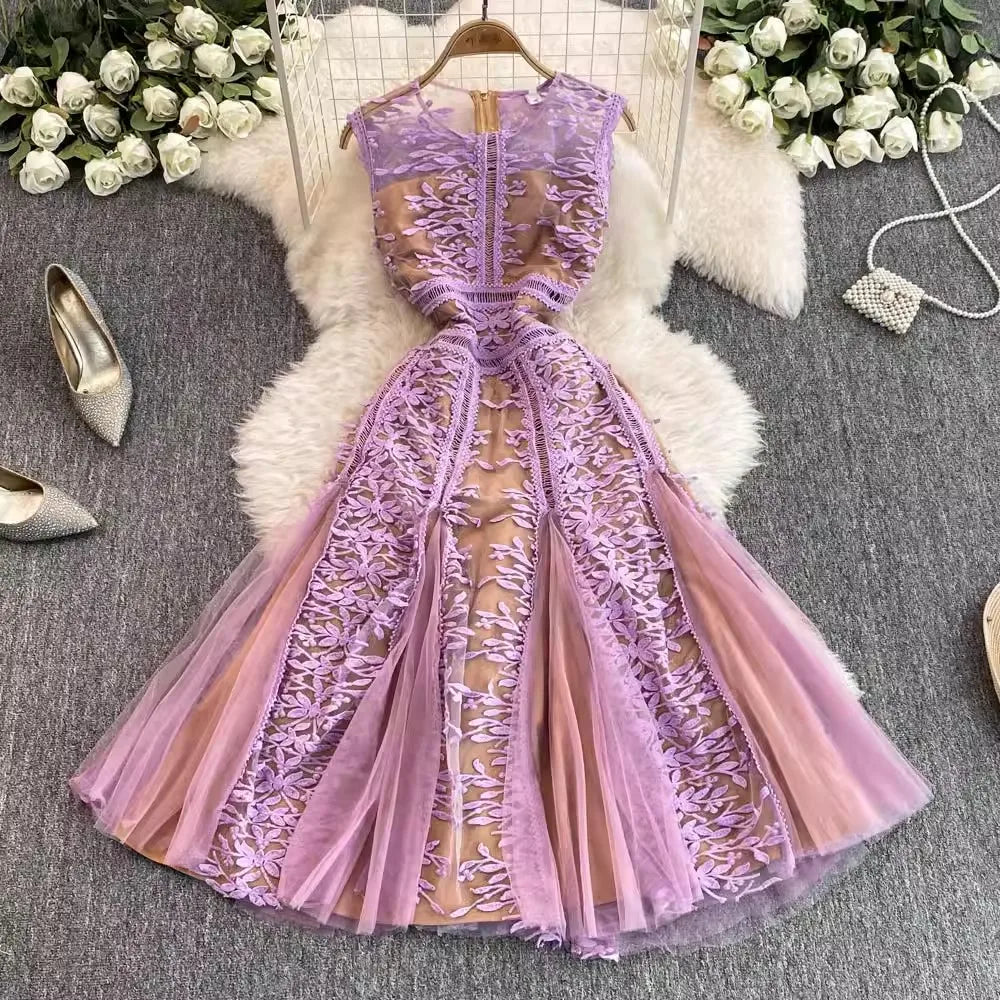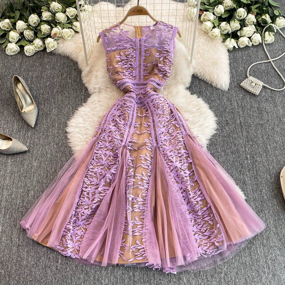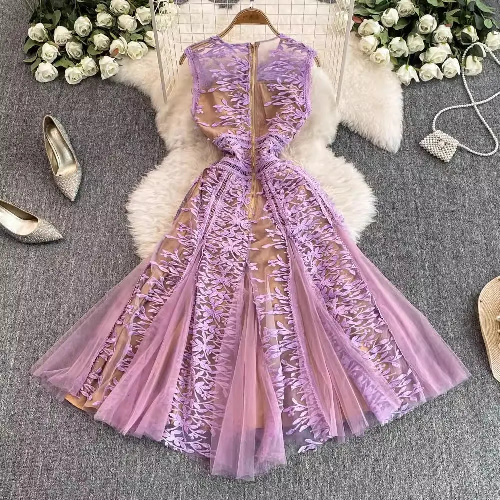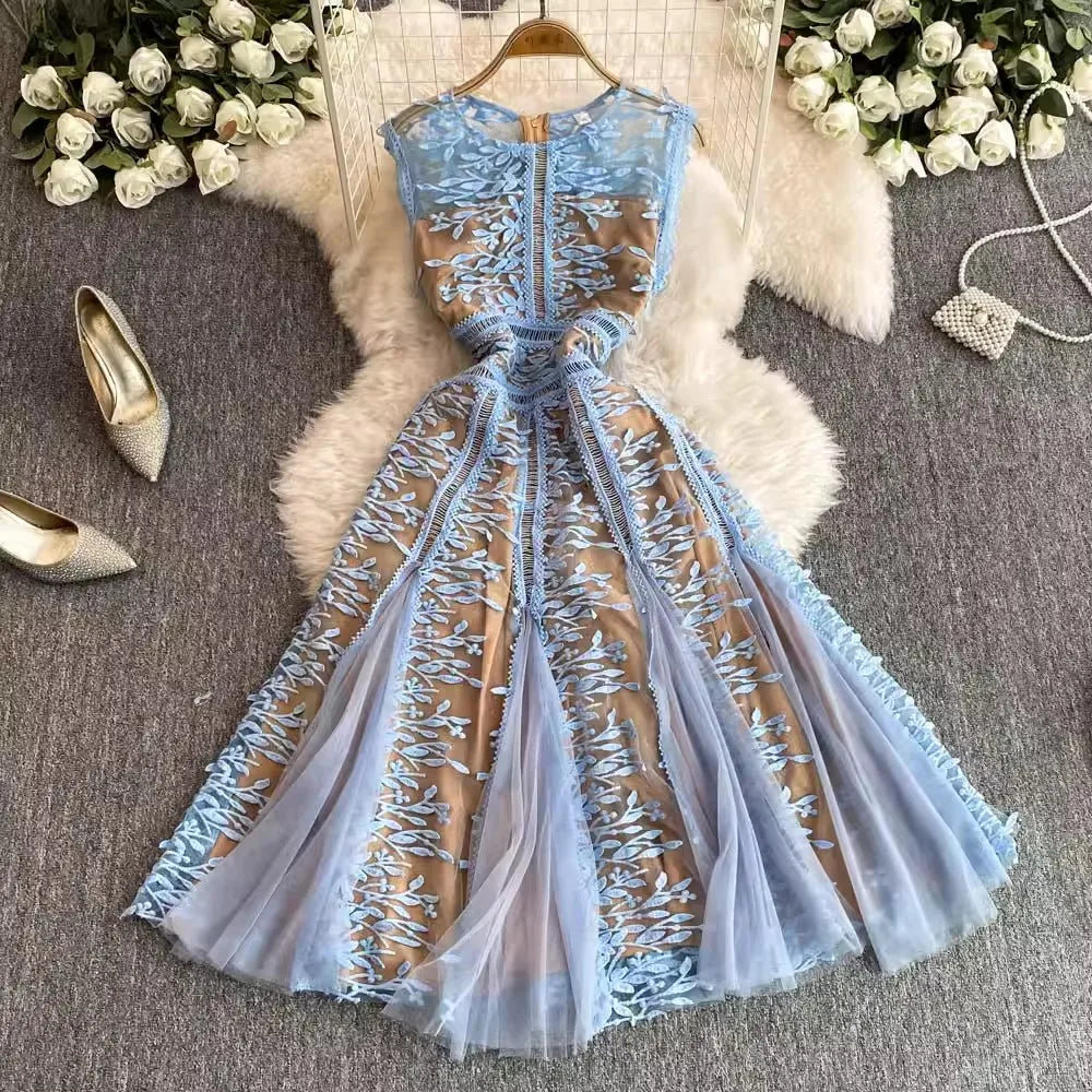 Solid Mesh Embroidery Dress Women's Sleeveless Round Neck Hollow Out Tulles Vestido