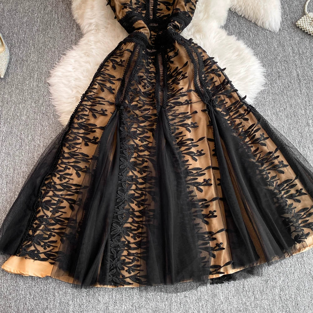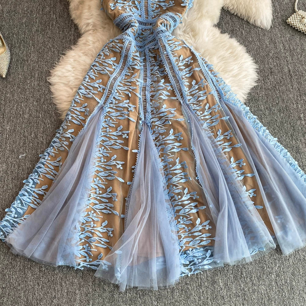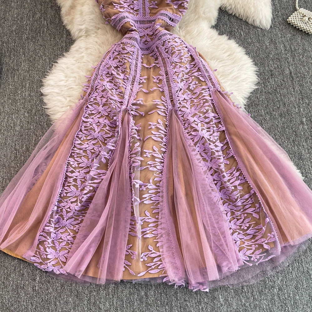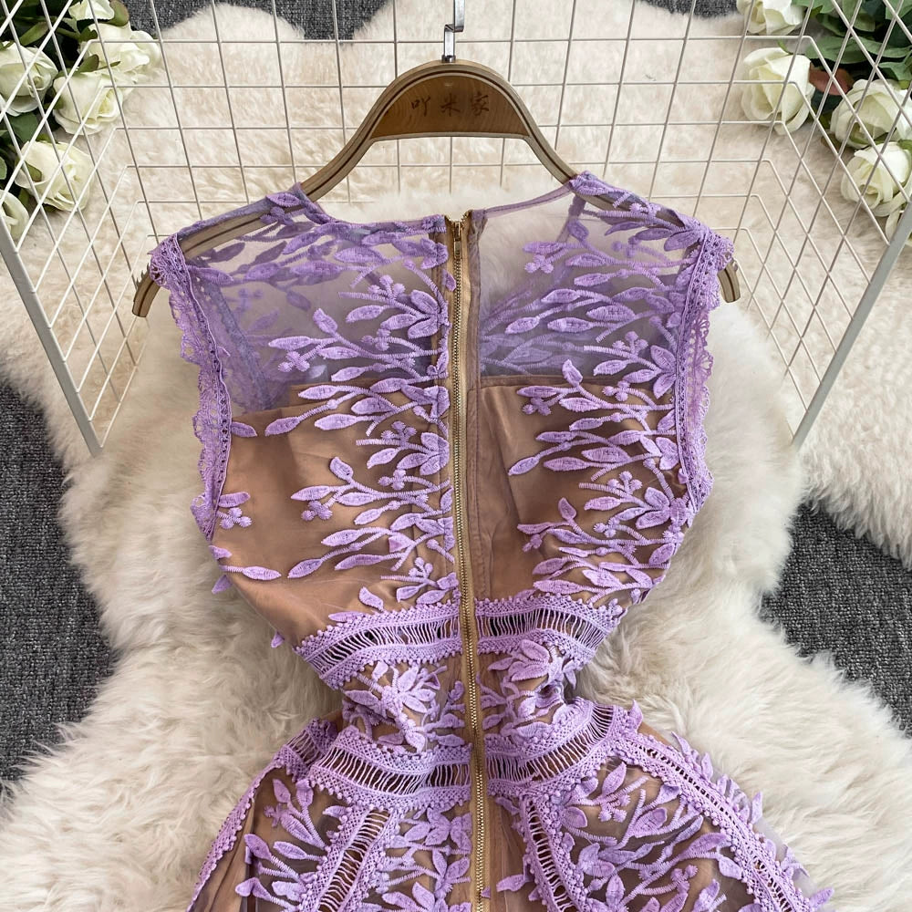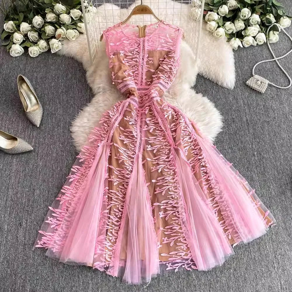 Solid Mesh Embroidery Dress Women's Sleeveless Round Neck Hollow Out Tulles Vestido