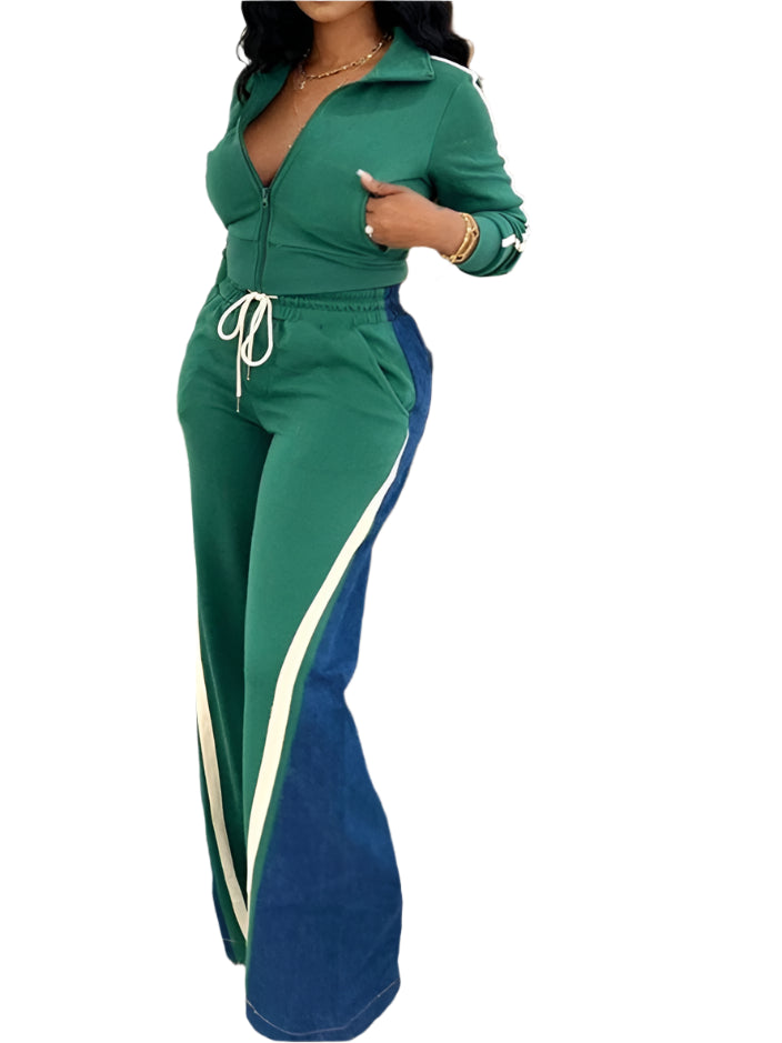 Casual 2 Piece Sets Women Outfit Color Blocks Long Sleeve Zipper Crop Top And Denim Patchwork Pants Suit Streetwear