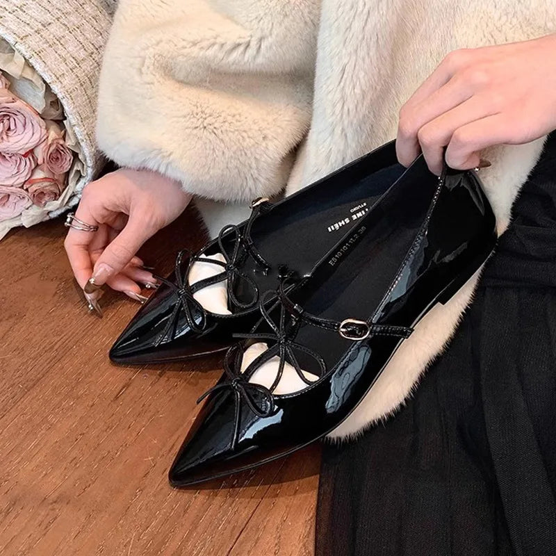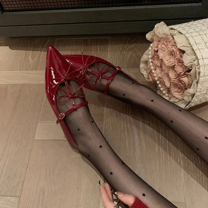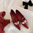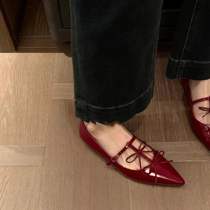 T-strap Pointed Toe Flats Shoes Women Bowtie Buckle Strap Flat burgundy Shoes