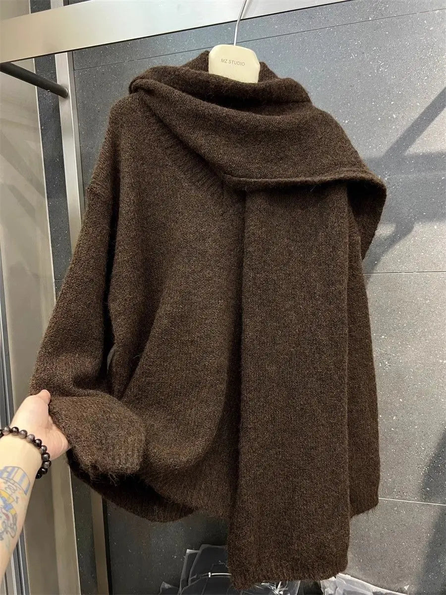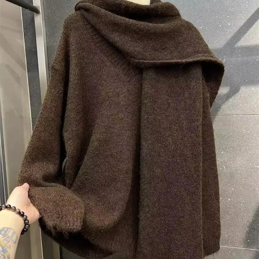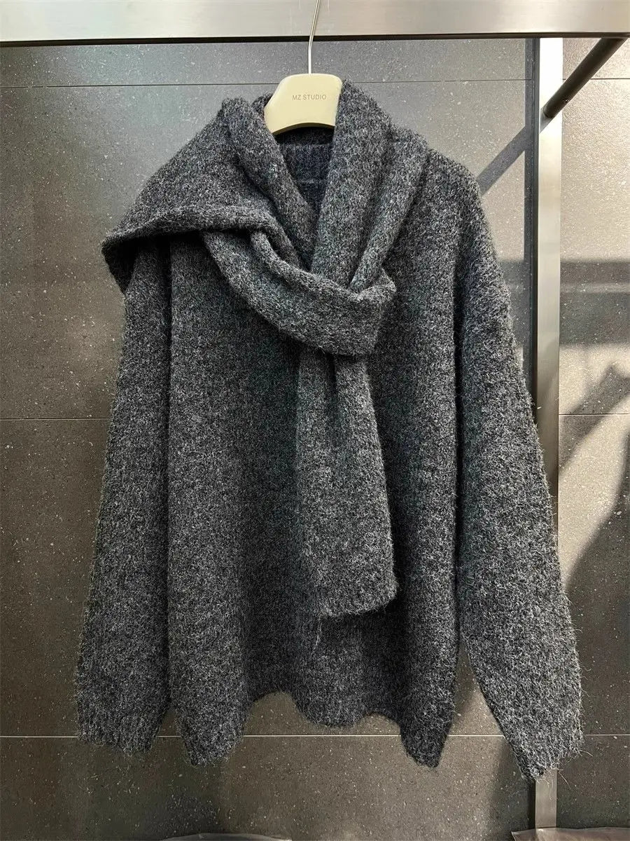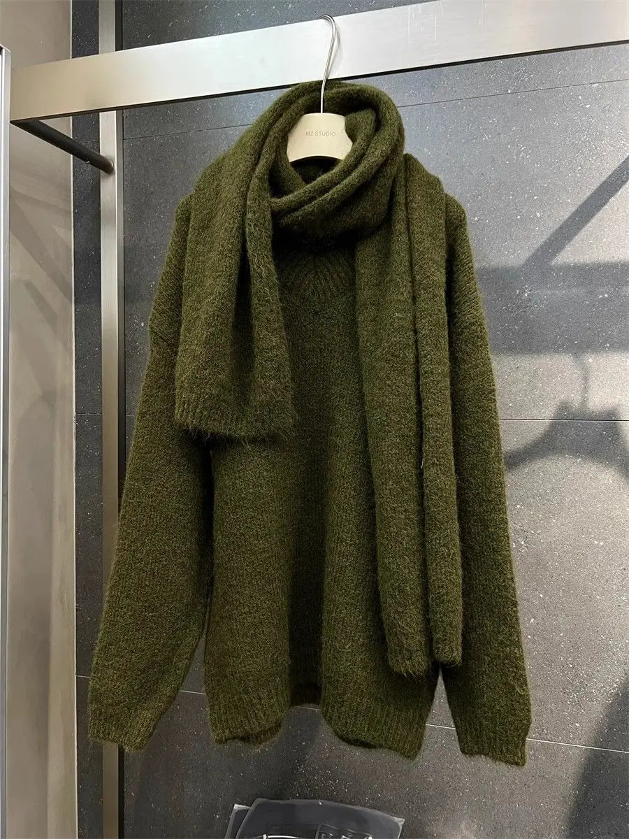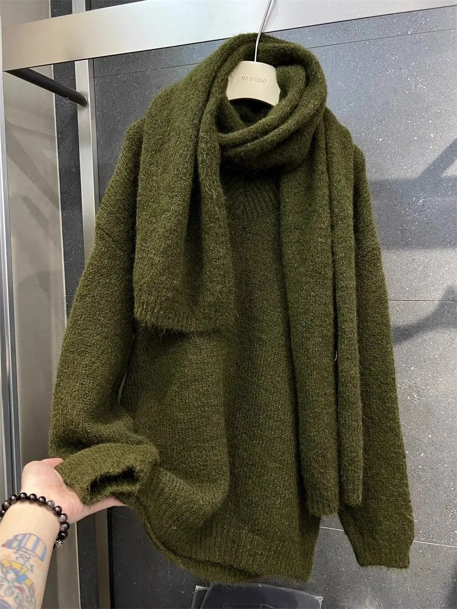 Two Piece Lazy Style Scarf Pullover Sweater Women's Inner Layer Winter Knitted Sweater