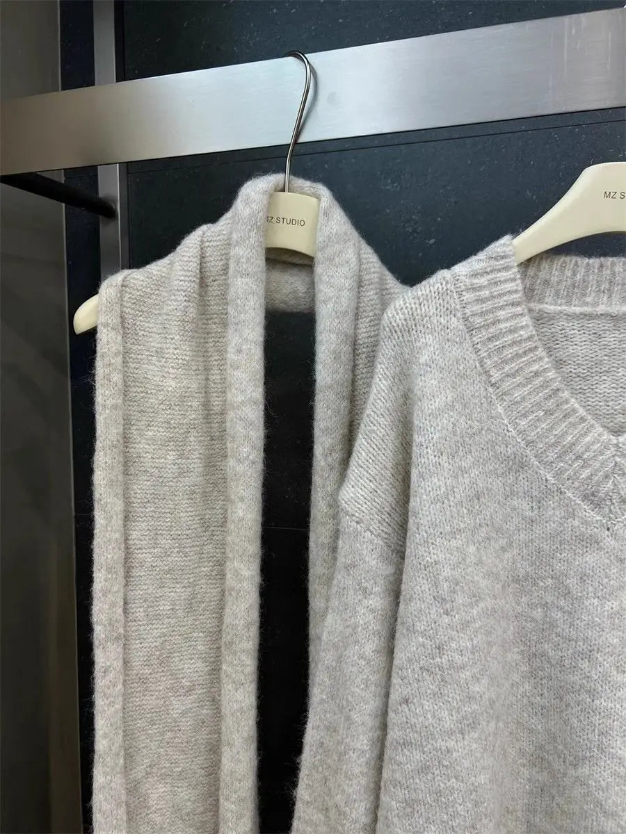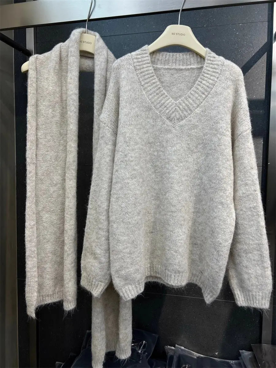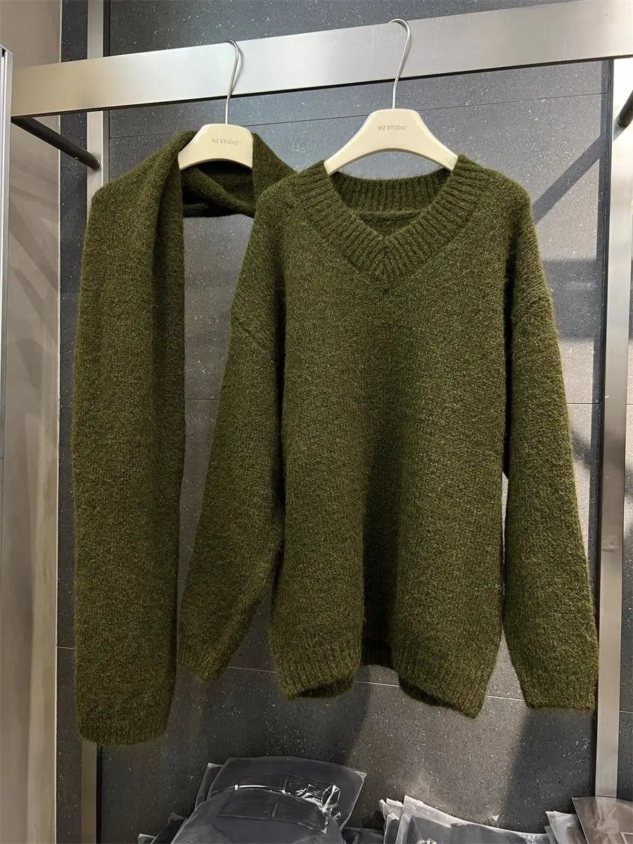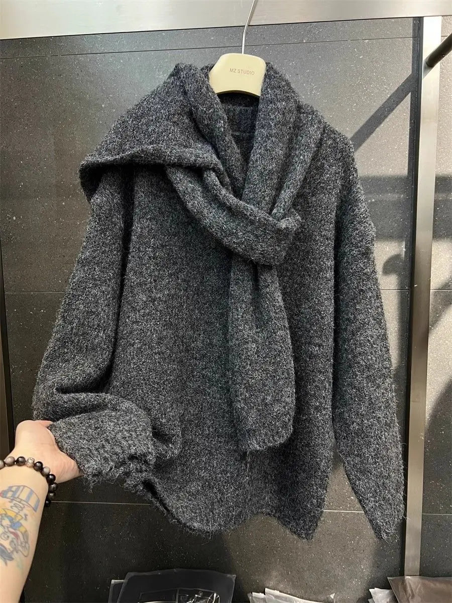 Two Piece Lazy Style Scarf Pullover Sweater Women's Inner Layer Winter Knitted Sweater