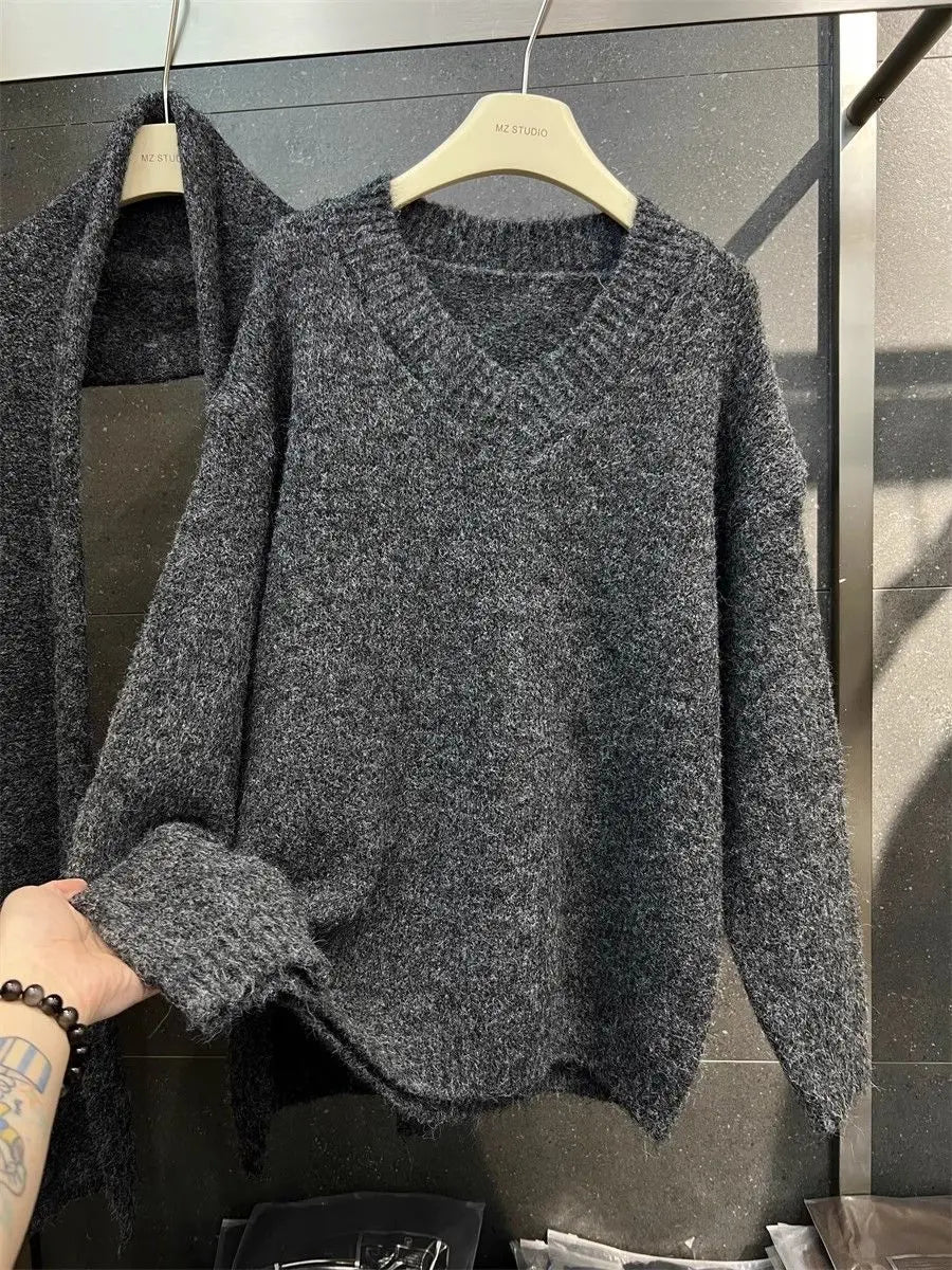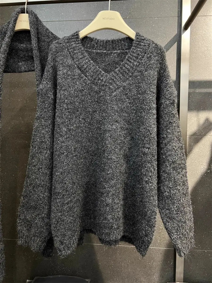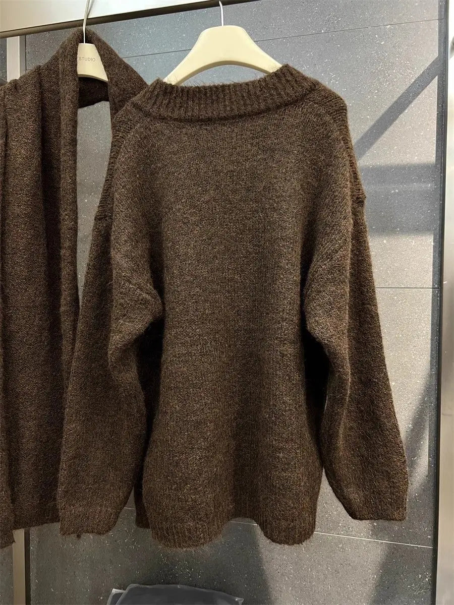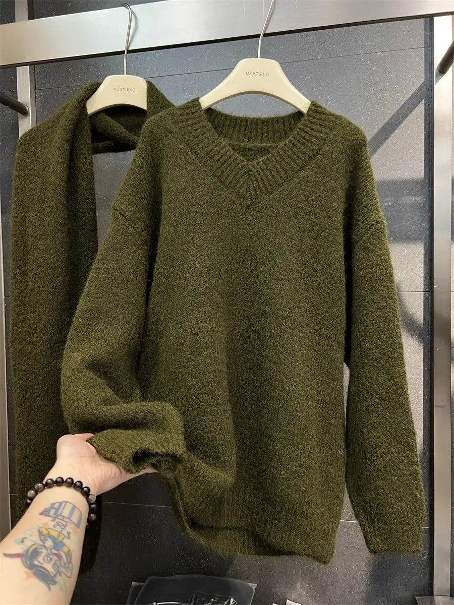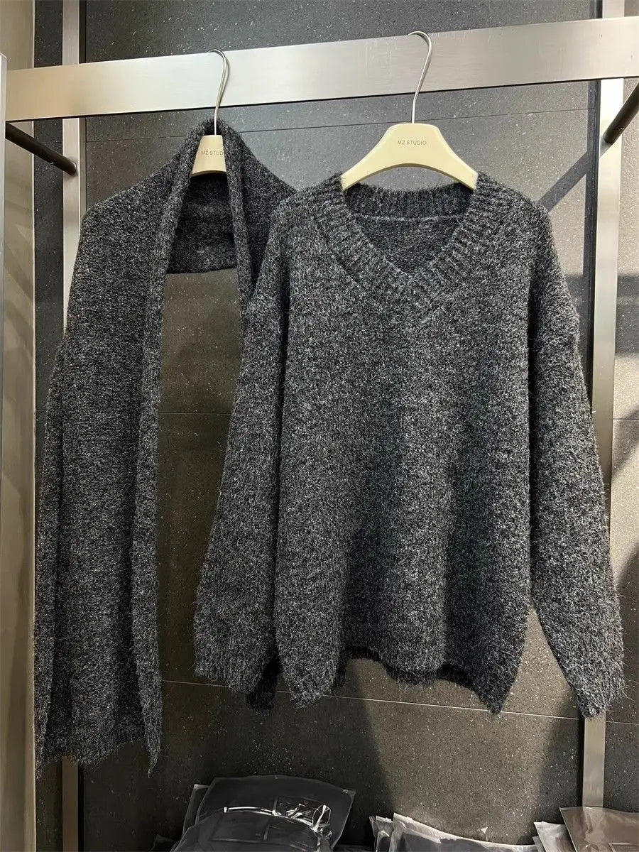 Two Piece Lazy Style Scarf Pullover Sweater Women's Inner Layer Winter Knitted Sweater
