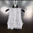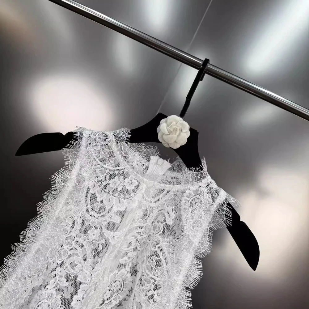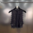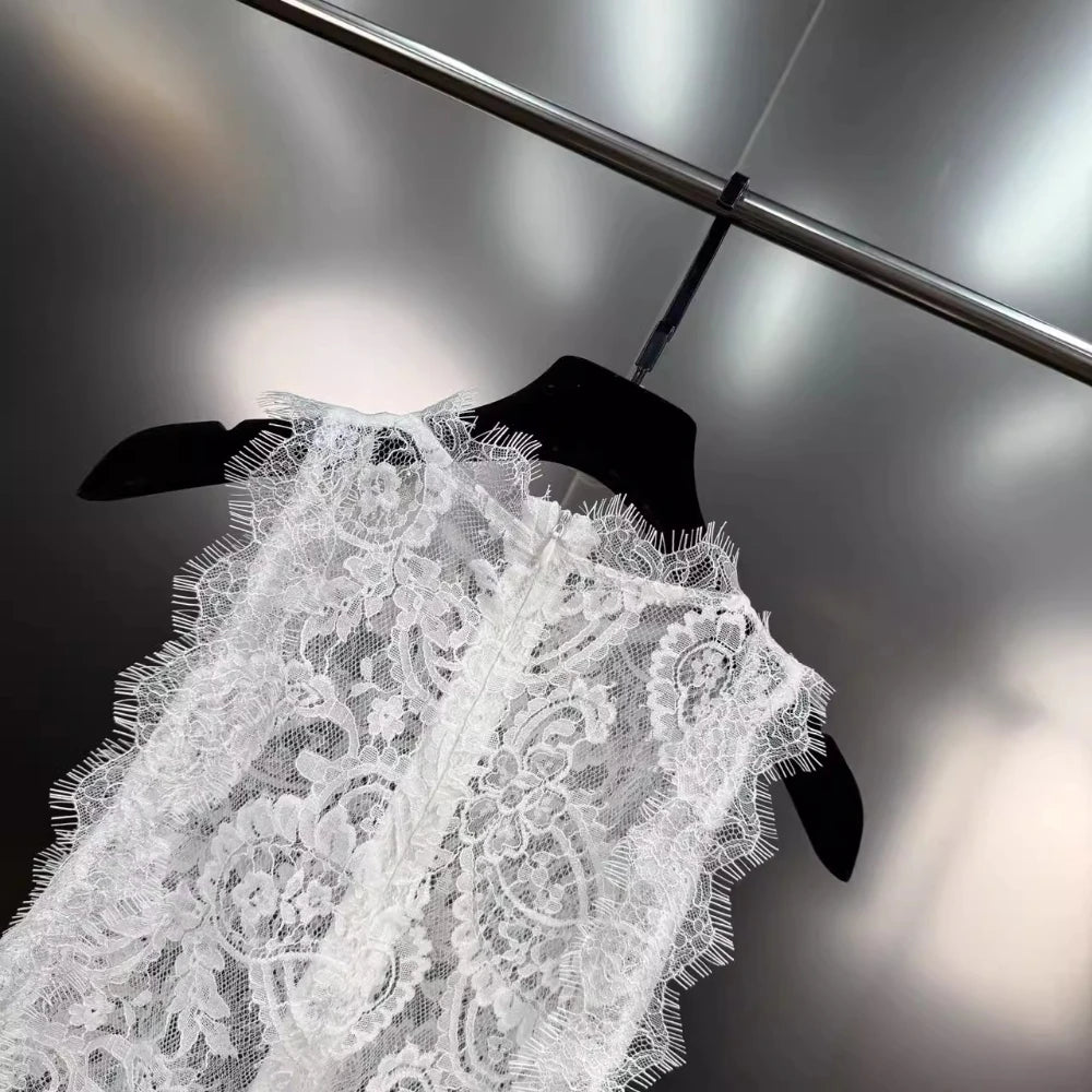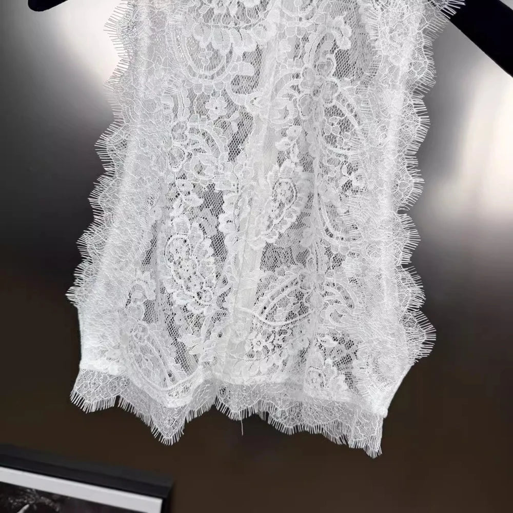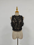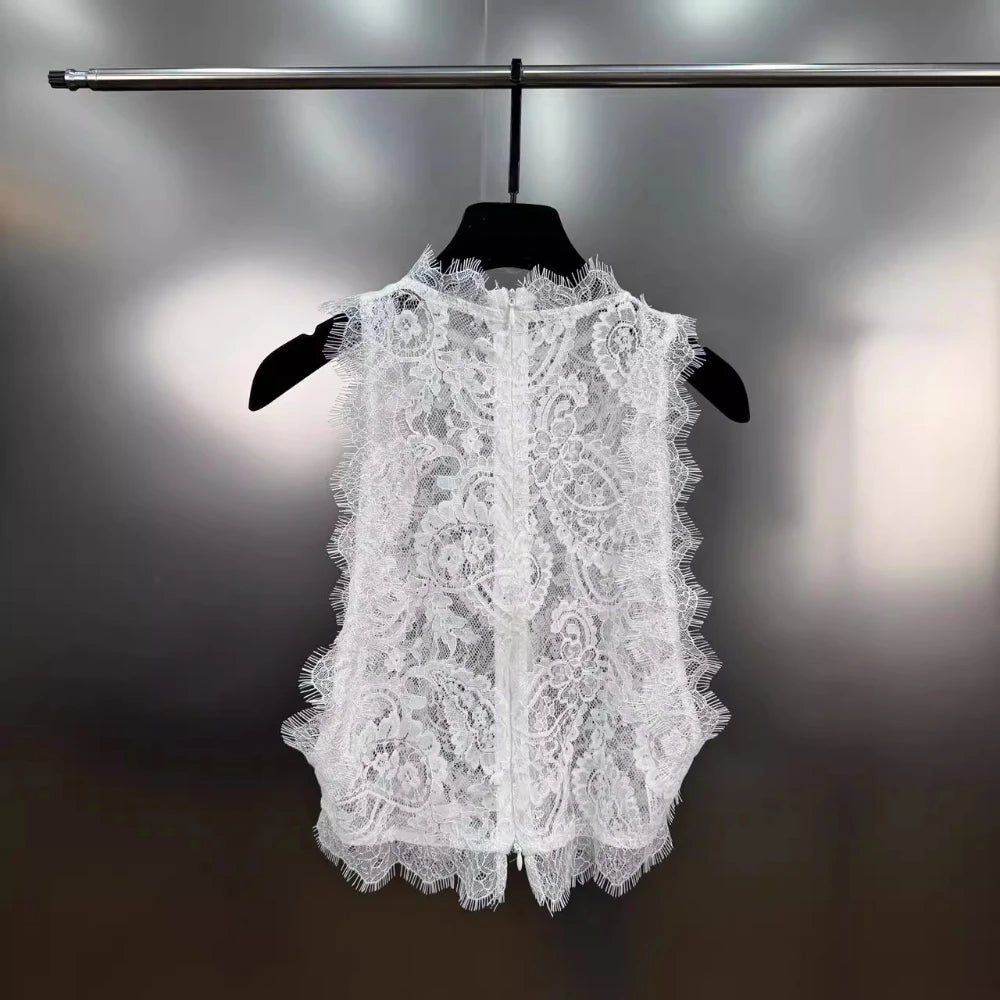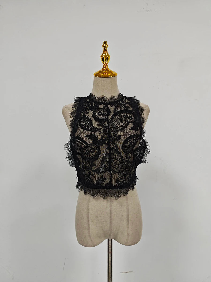 Vintage Spliced Zipper Sheer Vest for Women O Neck Sleeveless Lace Edge Top