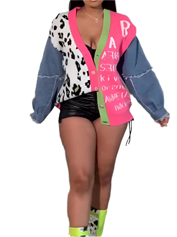 Denim Cardigan Patchwork Long Sleeves Cardigan Sweater for Women