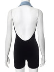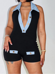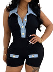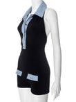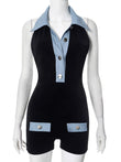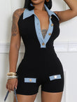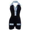 Denim Patchwork Rompers Polo-Neck Backless Sleeveless Vacation Playsuits