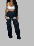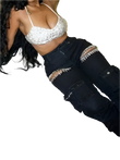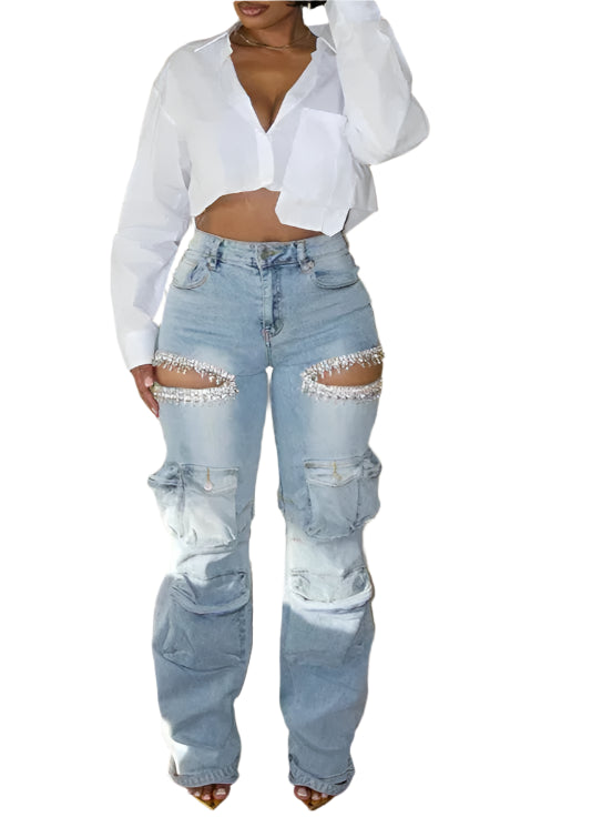 Women Jeans Pants with Tassel Diamond Pieces Mid Waist Straight Leg Denim Multi Pockets Pants