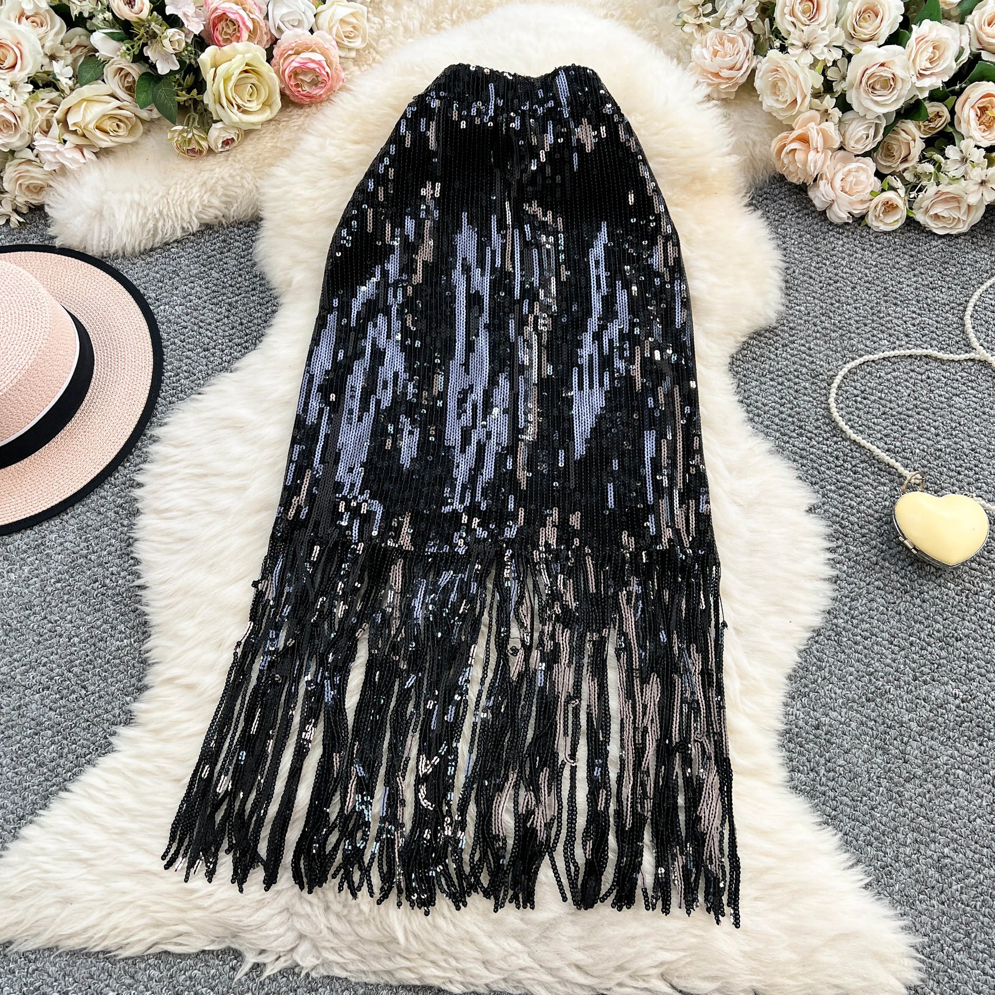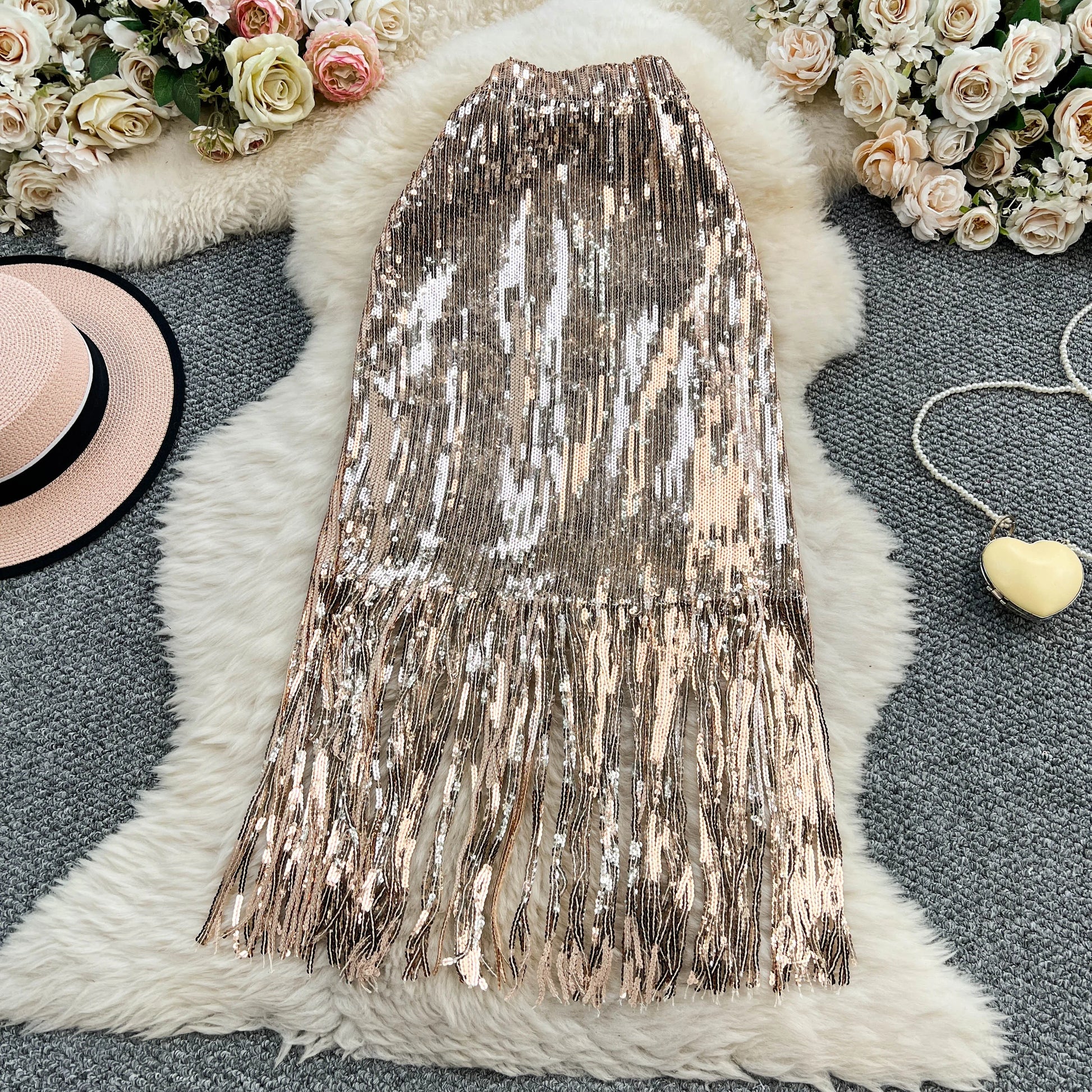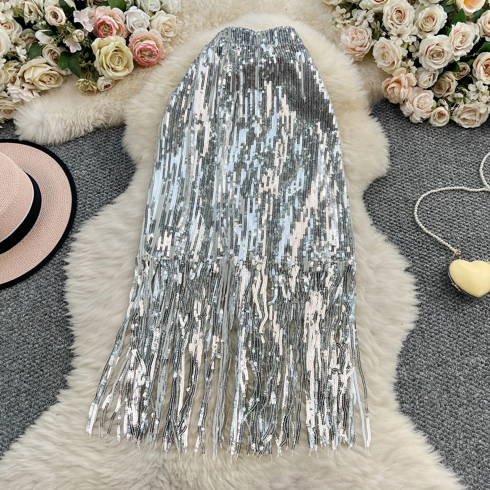 Women Chic Sequin tassel glitter Skirt High Waist Elegant Korean Fashion Skirt
