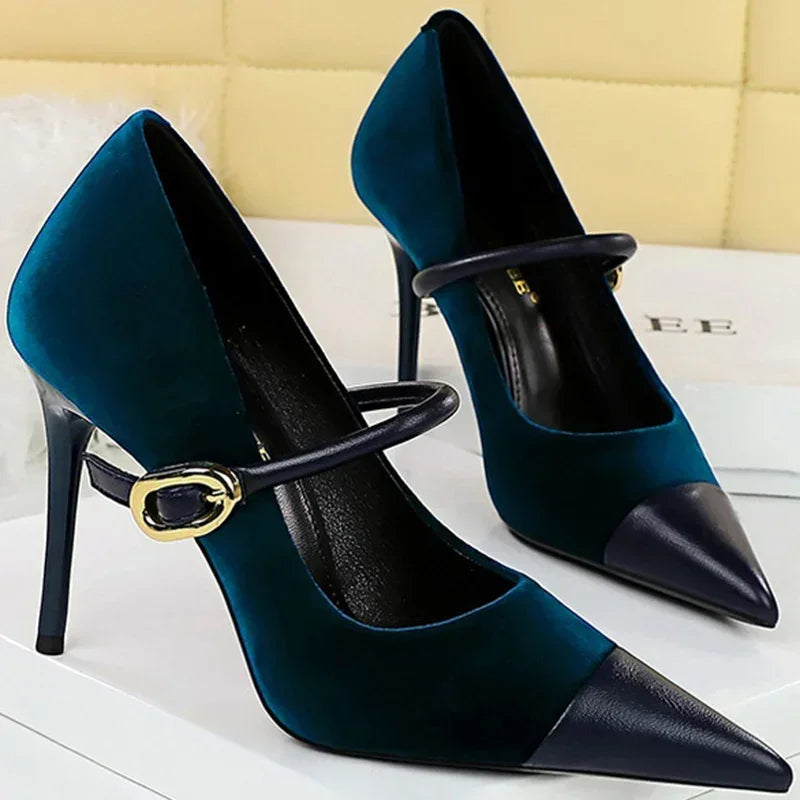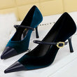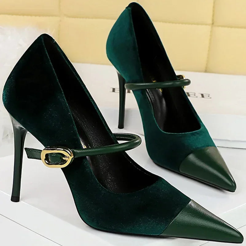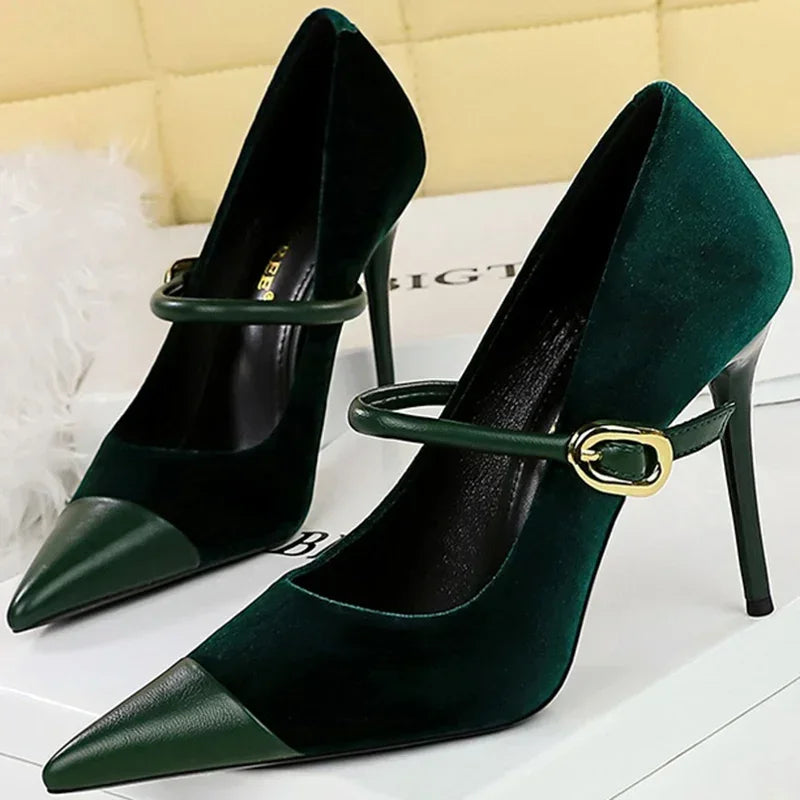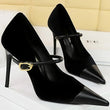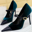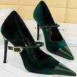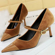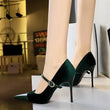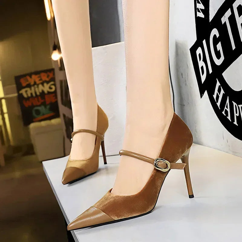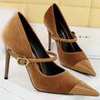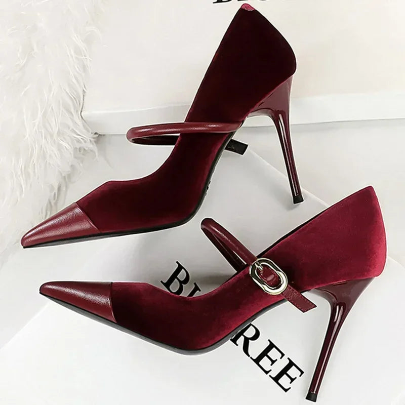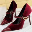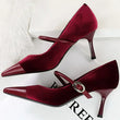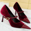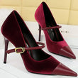 Women Pointed Toe 7cm 10cm Stiletto High Heels Party Mary Jane Pumps Lady Metal Buckle Prom Camel Strap Velvet Burgundy Shoes