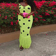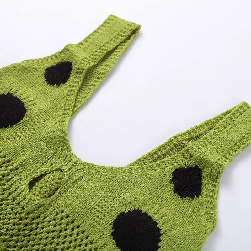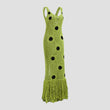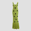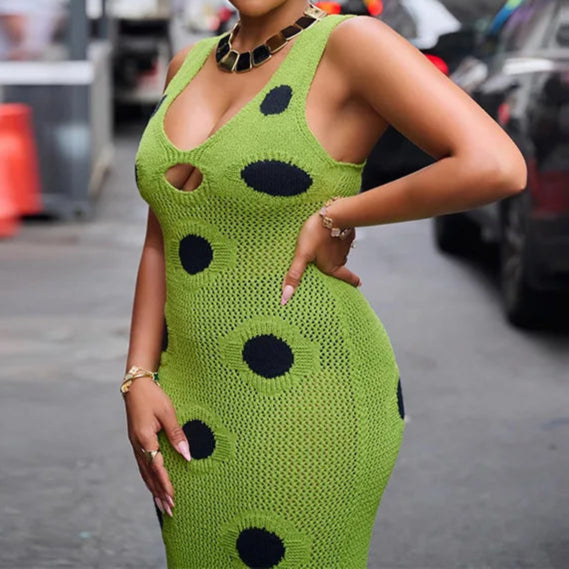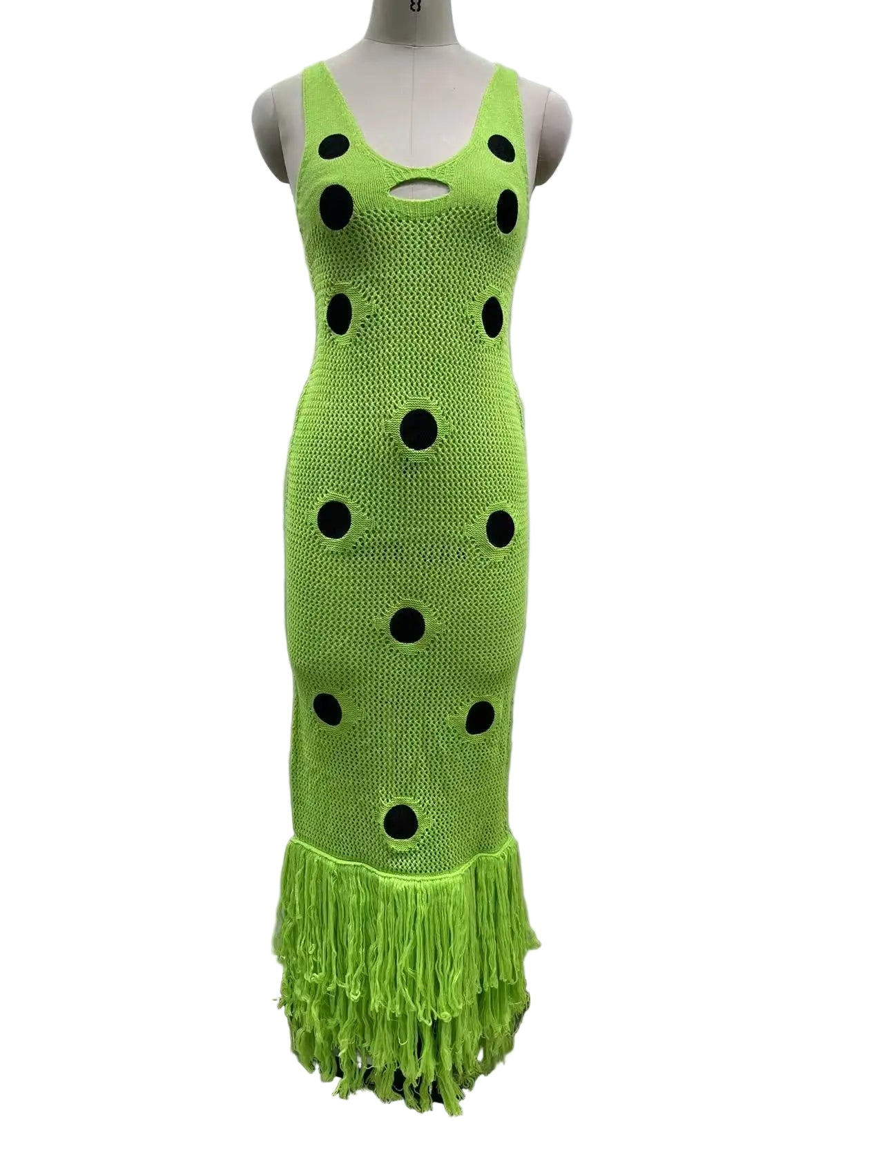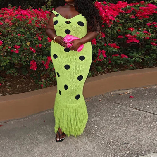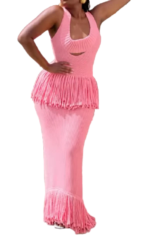 Women Knitted Maxi Dress Hollow Out Deep Neck Tassel Hem Maxi Dress