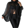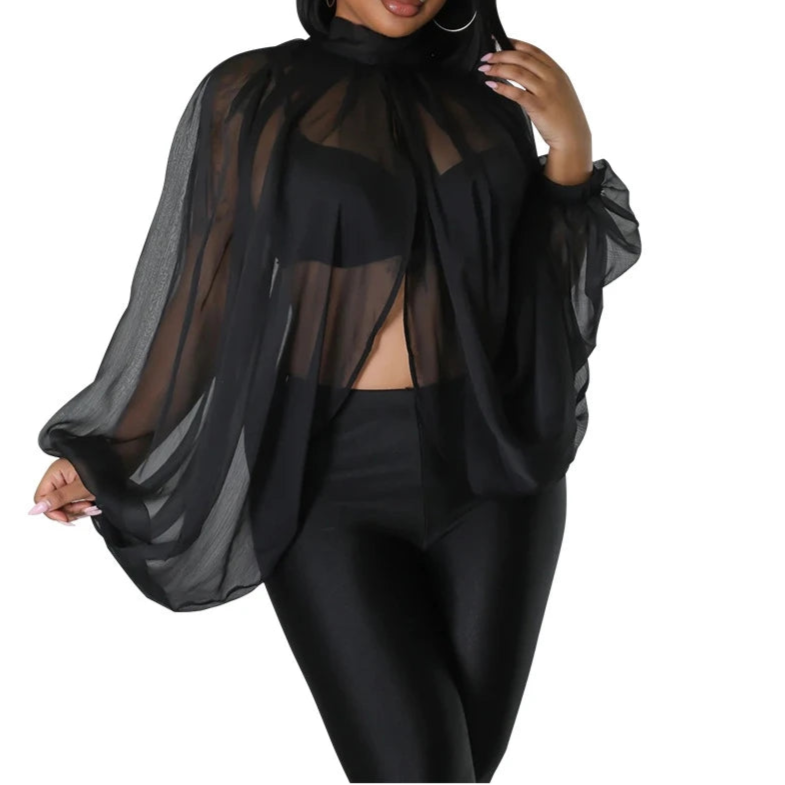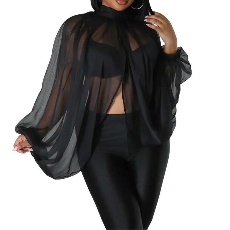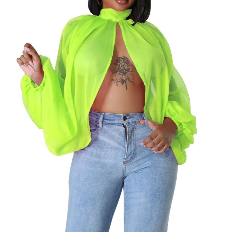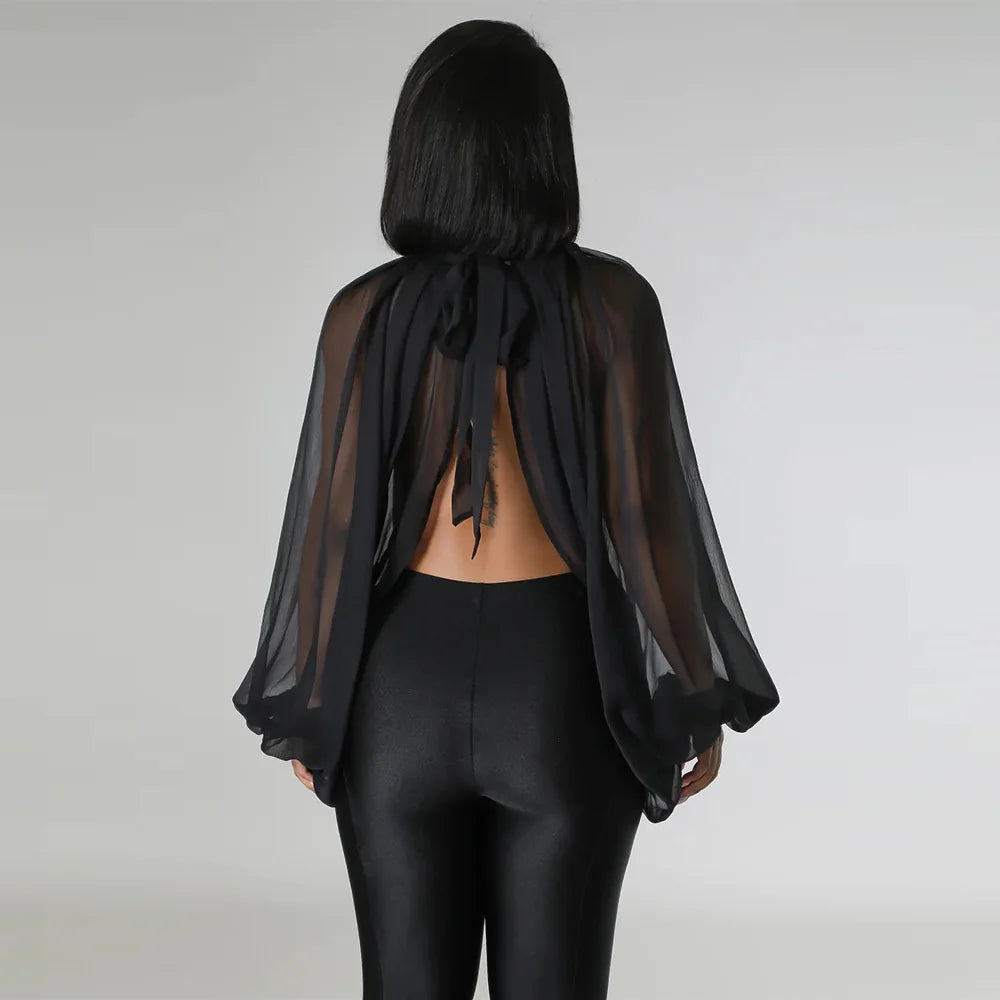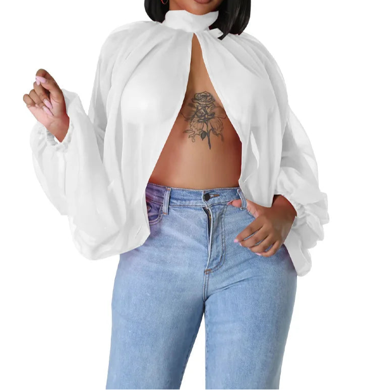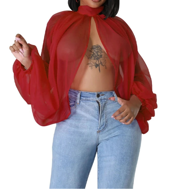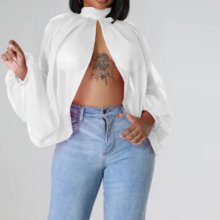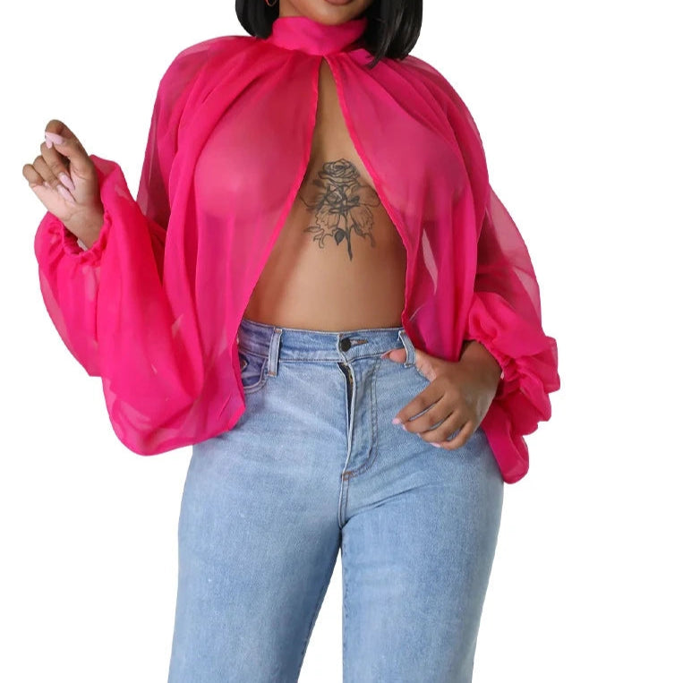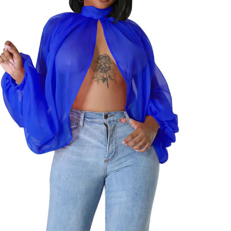 Womens Chiffon Blouse Sexy See Through Lantern Sleeve Front Back Open High Neck Blouses Tops