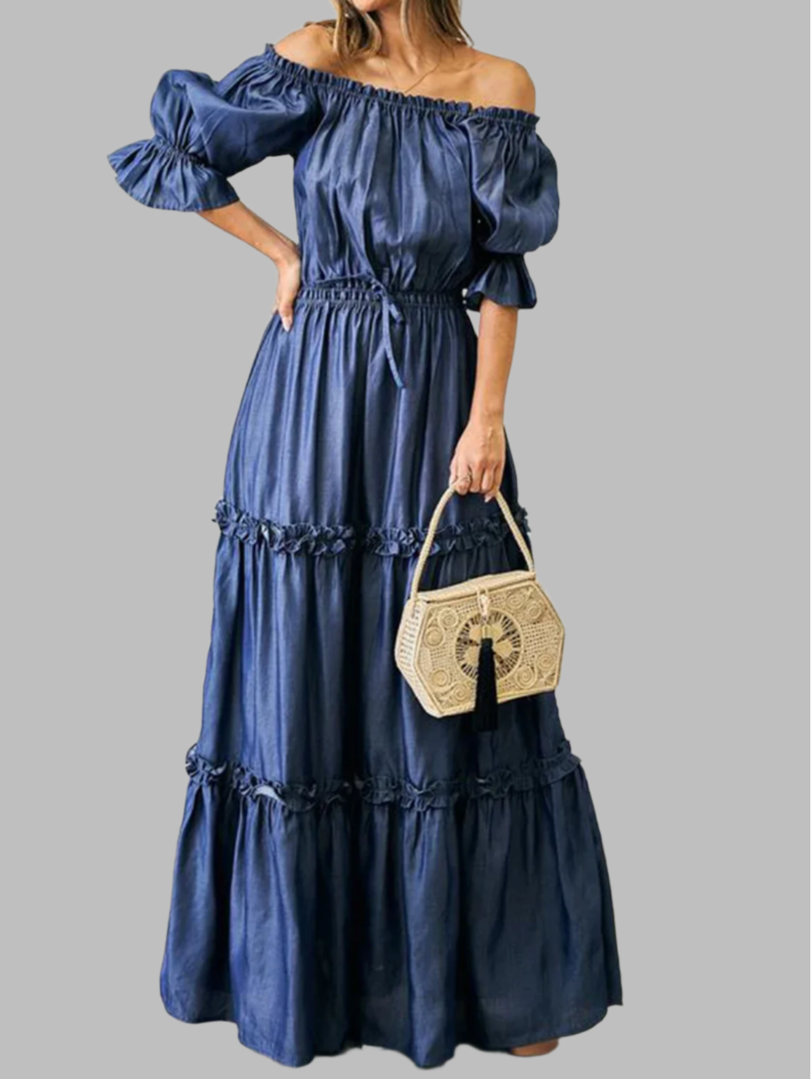 Women's Plus Size Off-Shoulder Dress Ruffle Sleeve Stretchy Elegant Vintage Casual Sweet Summer Long A-Line Pleated Gown