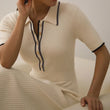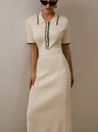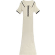 Women's White Knit Midi Dress, Short Sleeve, Patchwork, Elegant Sweater Dress